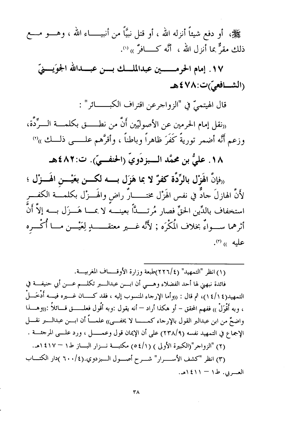 ((نقل إمام الحرمين عن الأصوليّين أَنَّ من نطق بكلمة الرِّدَّة، وزعم أَنَّه أضمر توريةً كَفَرَ ظاهراً وباطناً، وأقرَّهم على ذلك)) (¬2)