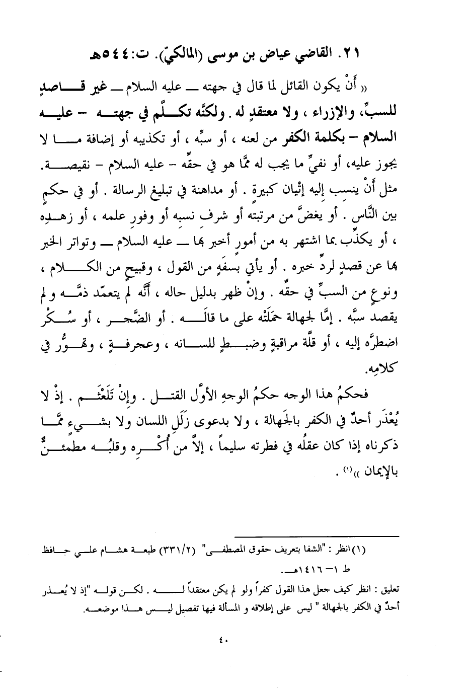 (¬1) "الشفا بتعريف حقوق المصطفى" (2/331) طبعة هشام علي حافظ ط1 - 1416هـ. فانظر كيف جعل هذا القول كفراً ولو لم يكن معتقداً له. لكن قوله: ((إذ لا يعذر أحد في الكفر بالجهالة)) ليس على إطلاقه والمسألة فيها تفصيل ليس هذا موضعه.