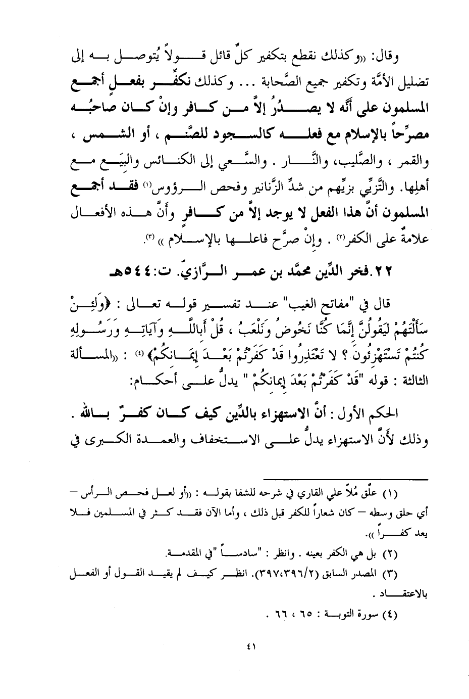 ... قال في "مفاتح الغيب" عند تفسير قوله تعالى: {وَلئِنْ سَأَلْتَهُمْ ليَقُولُنَّ إِنَّمَا كُنَّا نَخُوضُ وَنَلْعَبُ، قُلْ أَبِاللَّهِ وَآيَاتِهِ وَرَسُولِهِ كُنتُمْ تَسْتَهْزِئُونَ؟ لا تَعْتَذِرُوا قَدْ كَفَرْتُمْ بَعْدَ إِيمَانِكُمْ (¬4) } : ((المسألة الثالثة: قوله "قَدْ كَفَرْتُمْ بَعْدَ إِيمانِكُمْ " يدلُّ على أحكام: