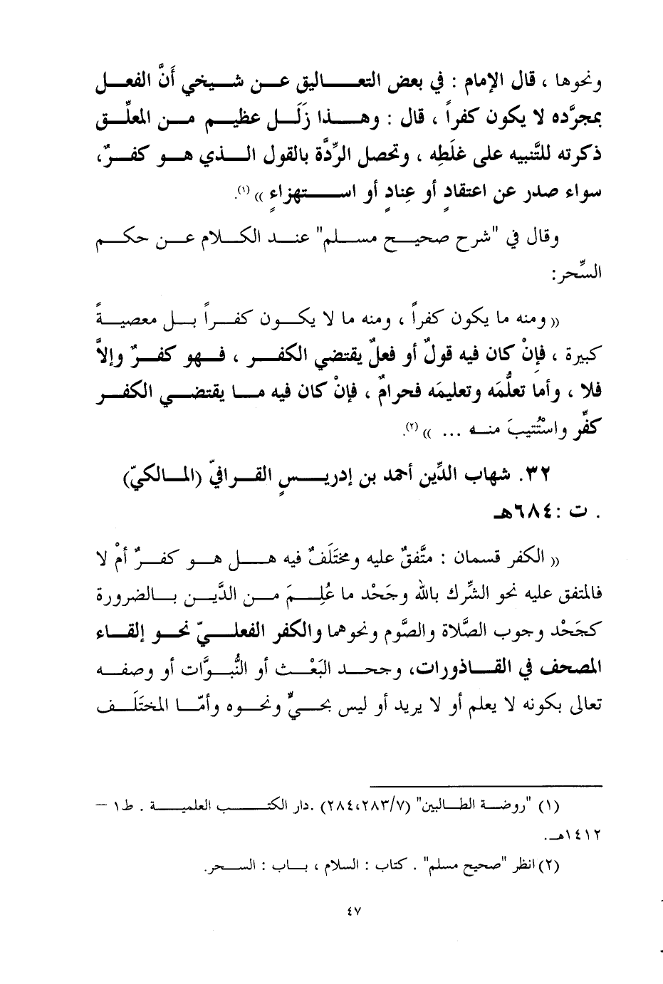 ((ومنه ما يكون كفراً، ومنه ما لا يكون كفراً بل معصيةً كبيرة، فإِنْ كان فيه قولٌ أو فعلٌ يقتضي الكفر، فهو كفرٌ وإلاَّ فلا، وأما تعلُّمَه وتعليمَه فحرامٌ، فإنْ كان فيه ما يقتضي الكفر كفِّر واسْتُتيبَ منه ... )) (¬2) .