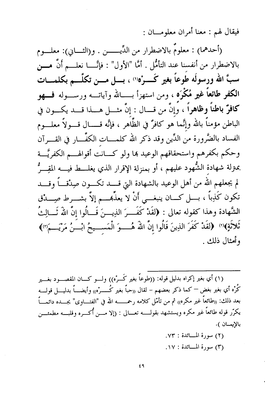(¬1) أي بغير إكراه بدليل قوله: ((طوعاً بغير كَرْه)) ولو كان المقصود بغير كُرْه أي بغير بغض - كما ذكر بعضهم - لقال ((حباً بغير كُرْه)) وأيضاً بدليل قوله بعد ذلك: ((طائعاً غير مكره)) ثم من تأمّل كلامه رحمه الله في "الفتاوى" يجده دائماً يكرّر قوله طائعاً غير مكره ويستشهد بقوله تعالى: (إلا من أُكره وقلبه مطمئن بالإيمان) .