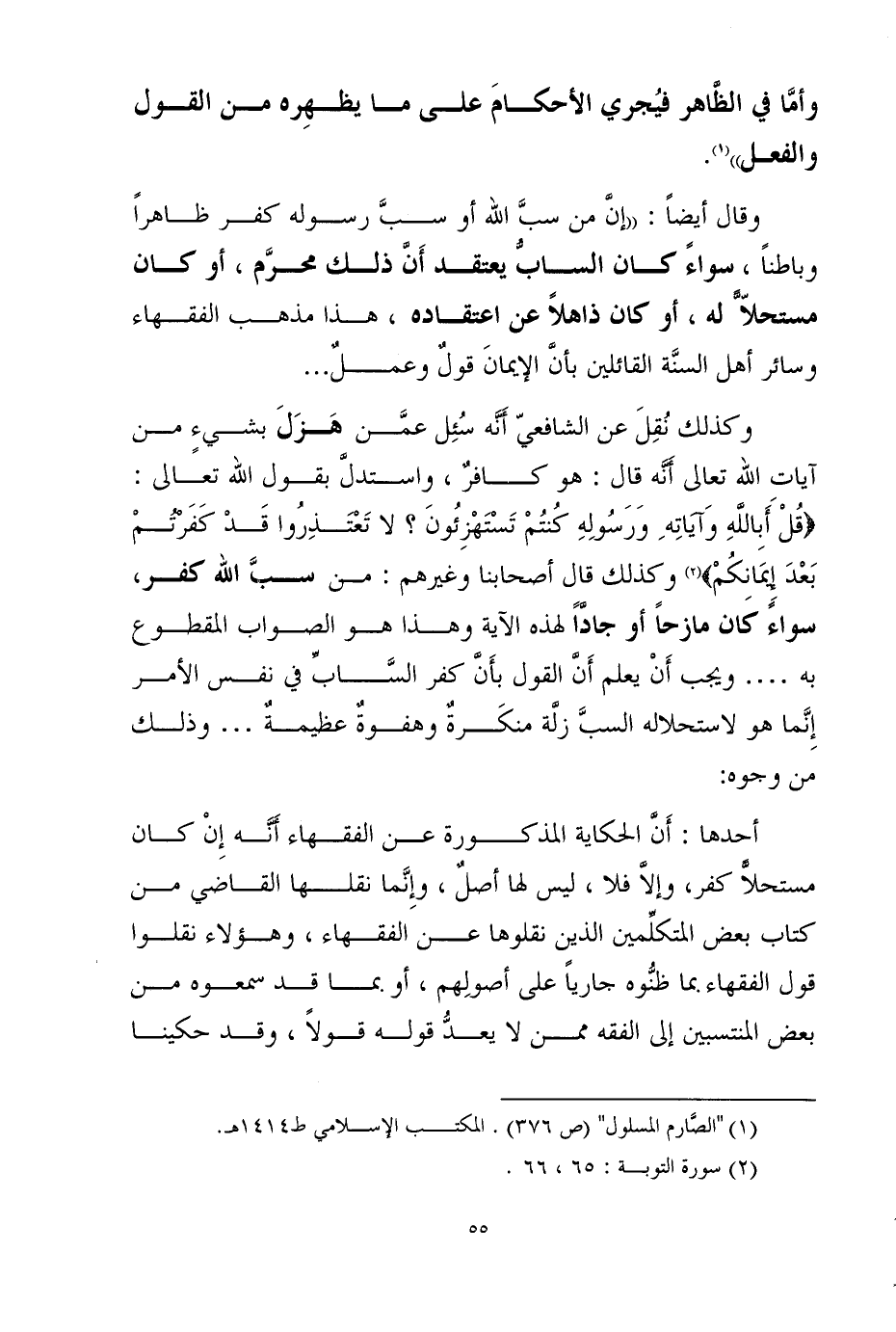 وقال أيضاً: ((إنَّ من سبَّ الله أو سبَّ رسوله كفر ظاهراً وباطناً، سواءً كان السابُّ يعتقد أَنَّ ذلك محرَّم، أو كان مستحلاًّّ له، أو كان ذاهلاً عن اعتقاده، هذا مذهب الفقهاء وسائر أهل السنَّة القائلين بأنَّ الإيمانَ قولٌ وعملٌ ...