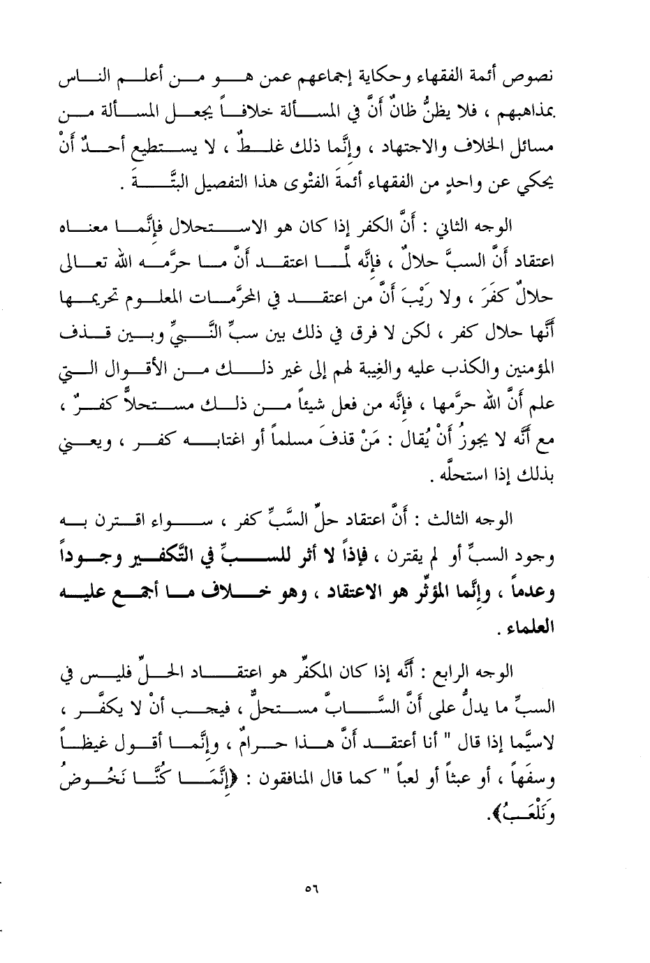 الوجه الرابع: أَنَّه إذا كان المكفِّر هو اعتقاد الحلِّ فليس في السبِّ ما يدلُّ على أَنَّ السَّابَّ مستحلٌّ، فيجب أنْ لا يكفَّر، لاسيَّما إذا قال " أنا أعتقد أَنَّ هذا حرامٌ، وإِنَّما أقول غيظاً وسفَهاً، أو عبثاً أو لعباً " كما قال المنافقون: {إِنَّمَا كُنَّا نَخُوضُ وَنَلْعَبُ} .