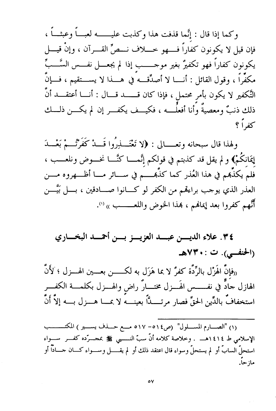 (¬1) "الصارم المسلول" (ص514- 517 مع حذف يسير) المكتب الإسلامي ط 1414هـ. وخلاصة كلامه أنّ سبّ النبي ? بمجرّده كفر سواء استحلّ السابّ أو لم يستحلّ وسواء قال اعتقد ذلك أو لم يقل وسواء كان جادّاً أو مازحاً.