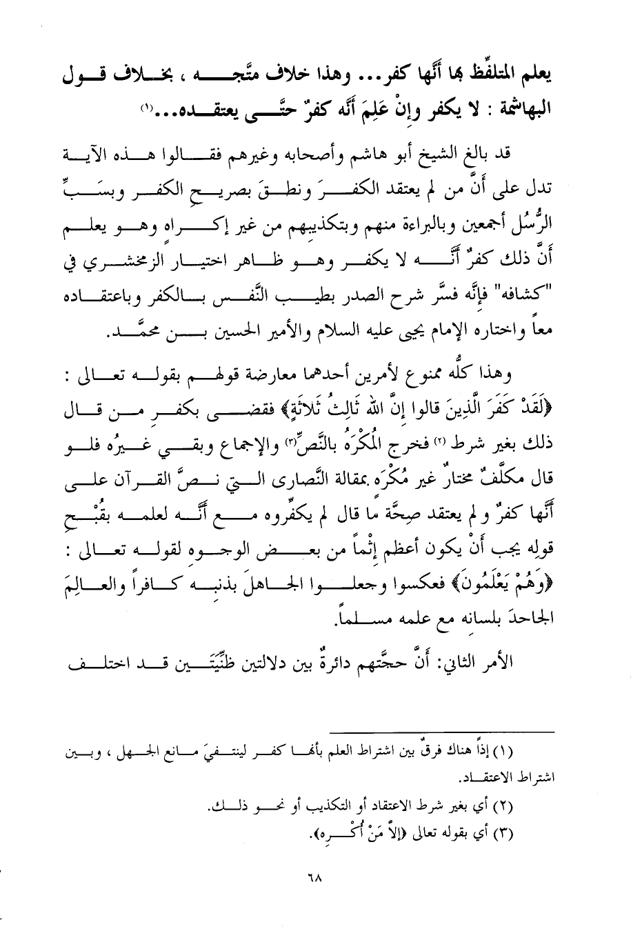 (¬1) إذاً هناك فرقٌ بين اشتراط العلم بأنها كفر لينتفيَ مانع الجهل، وبين اشتراط الاعتقاد.