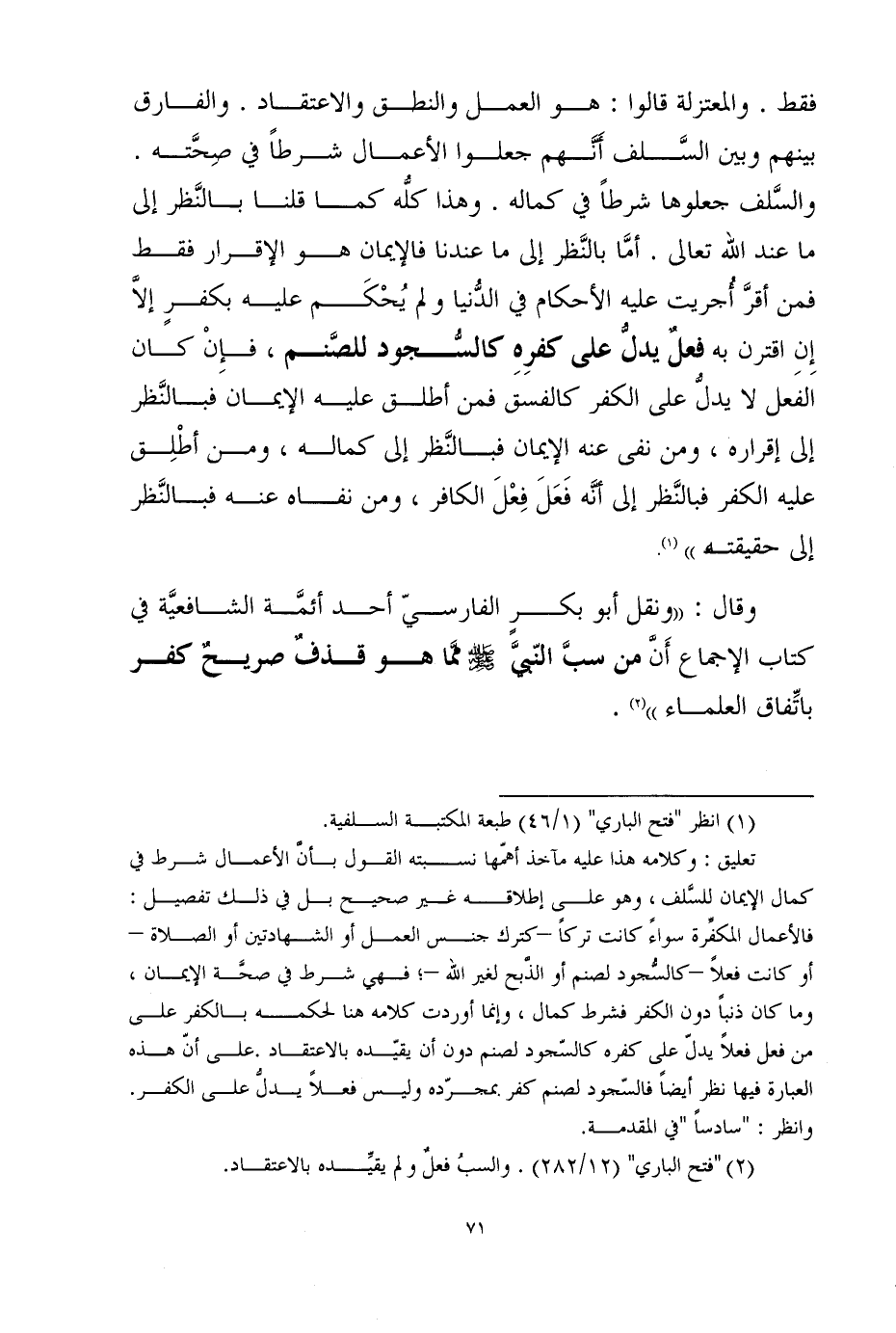 تعليق: وكلامه هذا عليه مآخذ أهمّها نسبته القول بأنَّ الأعمال شرط في كمال الإيمان للسَّلف، وهو على إطلاقه غير صحيح بل في ذلك تفصيل: فالأعمال المكفِّرة سواءً كانت تركاً -كترك جنس العمل أو الشهادتين أو الصلاة - أو كانت فعلاً -كالسُّجود لصنم أو الذَّبح لغير الله -؛ فهي شرط في صحَّة الإيمان، وما كان ذنباً دون الكفر فشرط كمال، وإنما أوردت كلامه هنا لحكمه بالكفر على من فعل فعلاً يدلّ على كفره كالسّجود لصنم دون أن يقيّده بالاعتقاد.على أنّ هذه العبارة فيها نظر أيضاً فالسّجود لصنم كفر بمجرّده وليس فعلاً يدلُّ على الكفر. وانظر: "سادساً "في المقدمة.