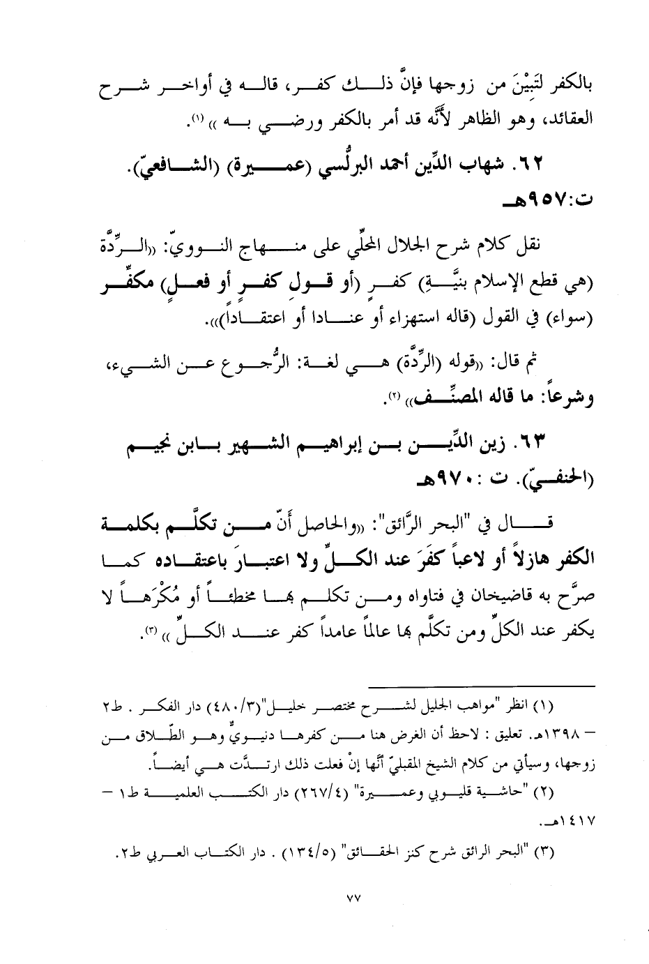 (¬1) انظر "مواهب الجليل لشرح مختصر خليل" (3/480) دار الفكر. ط2 - 1398هـ. تعليق: لاحظ أن الغرض هنا من كفرها دنيويٌّ وهو الطّلاق من زوجها، وسيأتي من كلام الشيخ المقبليّ أنَّها إنْ فعلت ذلك ارتدَّت هي أيضاً.