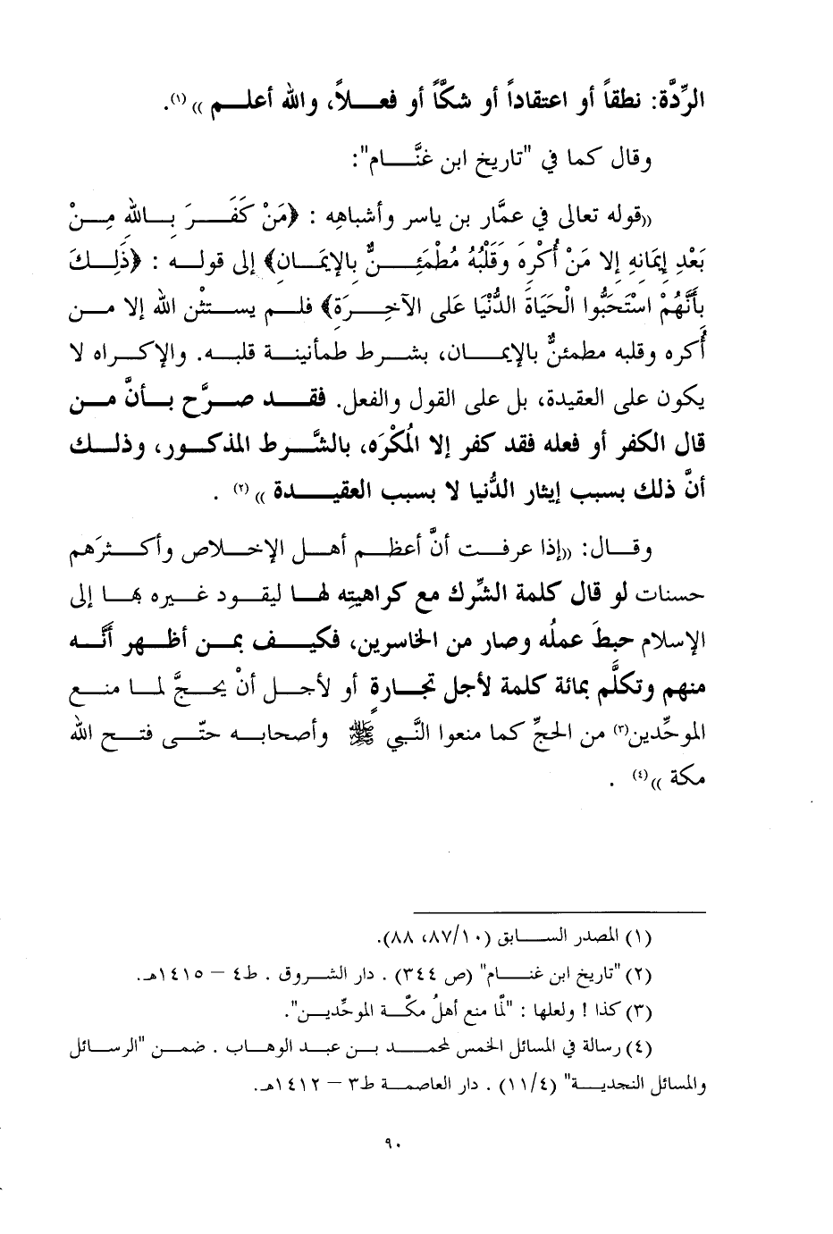 وقال: ((إذا عرفت أنَّ أعظم أهل الإخلاص وأكثرَهم حسنات لو قال كلمة الشِّرك مع كراهيتِه لها ليقود غيره بها إلى الإسلام حبِطَ عملُه وصار من الخاسرين، فكيف بمن أظهر أَنَّه منهم وتكلَّم بمائة كلمة لأجل تجارةٍ أو لأجل أنْ يحجَّ لما منع الموحِّدين (¬3) من الحجِّ كما منعوا النَّبي ? وأصحابه حتّى فتح الله مكة)) (¬4) .