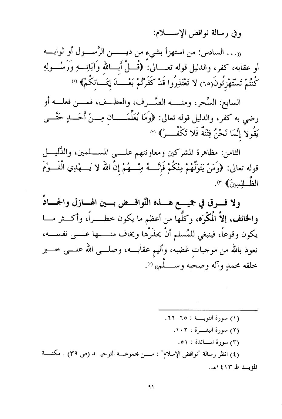 (¬4) انظر رسالة "نواقض الإسلام": من مجموعة التوحيد (ص 39) . مكتبة المؤيد ط 1413هـ.