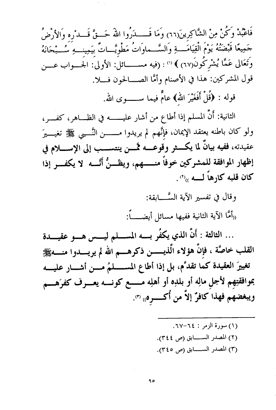 فَاعْبُدْ وَكُنْ مِنْ الشَّاكِرِينَ (66) وَمَا قَدَرُوا اللهَ حَقَّ قَدْرِهِ وَالأرْضُ جَمِيعًا قَبْضَتُهُ يَوْمَ الْقِيَامَةِ وَالسَّماوَاتُ مَطْوِيَّاتٌ بِيَمِينِهِ سُبْحَانَهُ وَتَعَالى عَمَّا يُشْرِكُونَ (67) } (¬1) : (فيه مسائل: الأولى: الجواب عن قول المشركين: هذا في الأصنام وأمَّا الصالحون فلا.