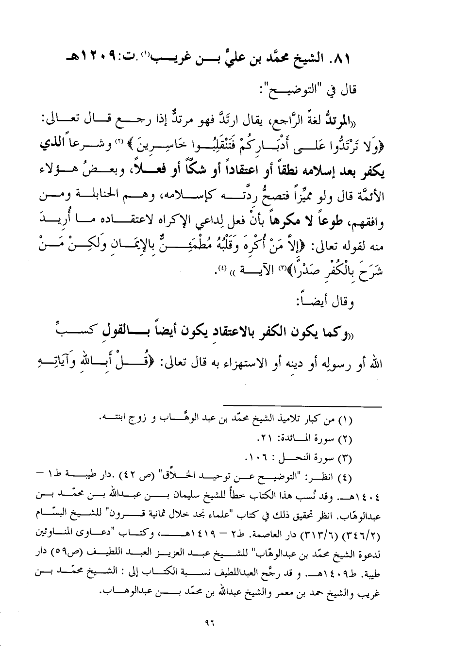 (¬4) انظر: "التوضيح عن توحيد الخلاَّق" (ص 42) .دار طيبة ط1 - 1404هـ. وقد نُسب هذا الكتاب خطأً للشيخ سليمان بن عبد الله بن محمّد بن عبد الوهّاب. انظر تحقيق ذلك في كتاب "علماء نجد خلال ثمانية قرون" للشيخ البسّام (2/346) (6/313) دار العاصمة. ط2 - 1419هـ، وكتاب "دعاوى المناوئين لدعوة الشيخ محمّد بن عبد الوهّاب" للشيخ عبد العزيز العبد اللطيف (ص59) دار طيبة. ط1409هـ. وقد رجَّح العبد اللطيف نسبة الكتاب إلى: الشيخ محمّد بن غريب والشيخ حمد بن معمر والشيخ عبد الله بن محمّد بن عبد الوهاب.