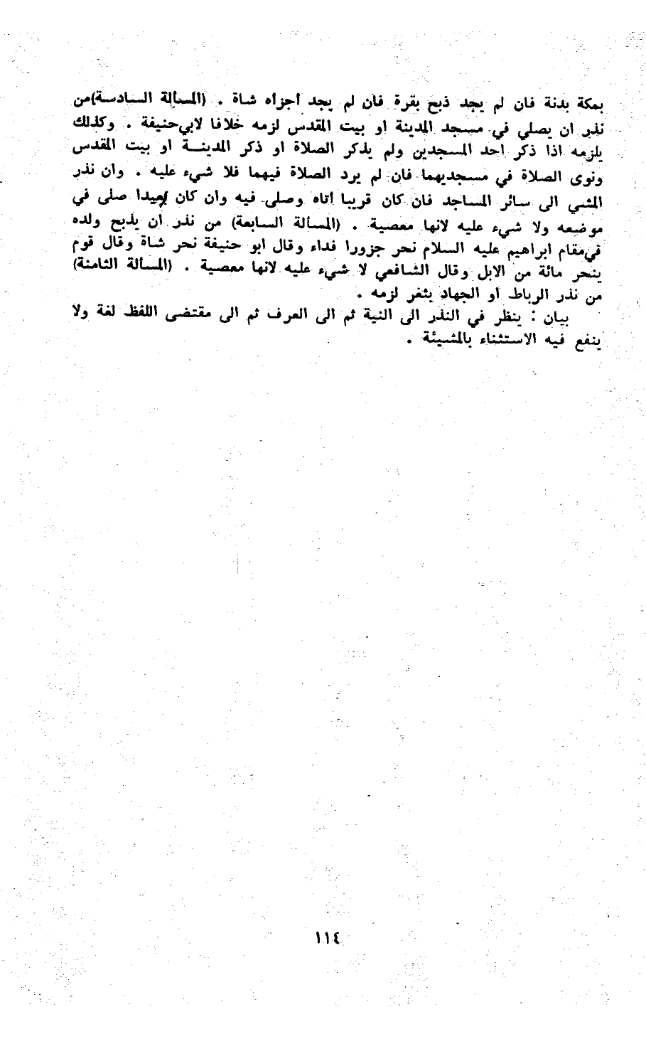 بِمَكَّة بَدَنَة فَإِن لم يجد ذبح بقرة فَإِن لم يجد أَجزَأَهُ شَاة (الْمَسْأَلَة السَّادِسَة) من نذر أنيصلي فِي مَسْجِد الْمَدِينَة أَو بَيت الْمُقَدّس لزمَه خلافًا لأبي حنيفَة وَكَذَلِكَ يلْزمه إِذا ذكر أحد المسجدين وَلم يذكر الصَّلَاة أَو ذكر الْمَدِينَة أَو بَيت الْمُقَدّس وَنوى الصَّلَاة فِي مسجديهما فَإِن لم يرد الصَّلَاة فيهمَا فَلَا شَيْء عَلَيْهِ وَأَن نذر الْمَشْي إِلَى سَائِر الْمَسَاجِد فَإِن كَانَ قَرِيبا أَتَاهُ وَصلى فِيهِ وَإِن كَانَ بَعيدا صلى فِي مَوْضِعه وَلَا شَيْء عَلَيْهِ لِأَنَّهَا مَعْصِيّة (الْمَسْأَلَة السَّابِعَة) من نذر أَن يذبح وَلَده فِي مقَام إِبْرَاهِيم عَلَيْهِ السَّلَام نحر جزورا فدَاء وَقَالَ أَبُو حنيفَة نحر شَاة وَقَالَ قوم ينْحَر مائَة من الْإِبِل وَقَالَ الشَّافِعِي لَا شَيْء عَلَيْهِ لِأَنَّهَا مَعْصِيّة (الْمَسْأَلَة الثَّامِنَة) من نذر الرِّبَاط أَو الْجِهَاد بثغر لزمَه بَيَان نظر فِي النّذر إِلَى النِّيَّة ثمَّ إِلَى الْعرف ثمَّ إِلَى مُقْتَضى اللَّفْظ لُغَة وَلَا ينفع فِيهِ الِاسْتِثْنَاء بِالْمَشِيئَةِ