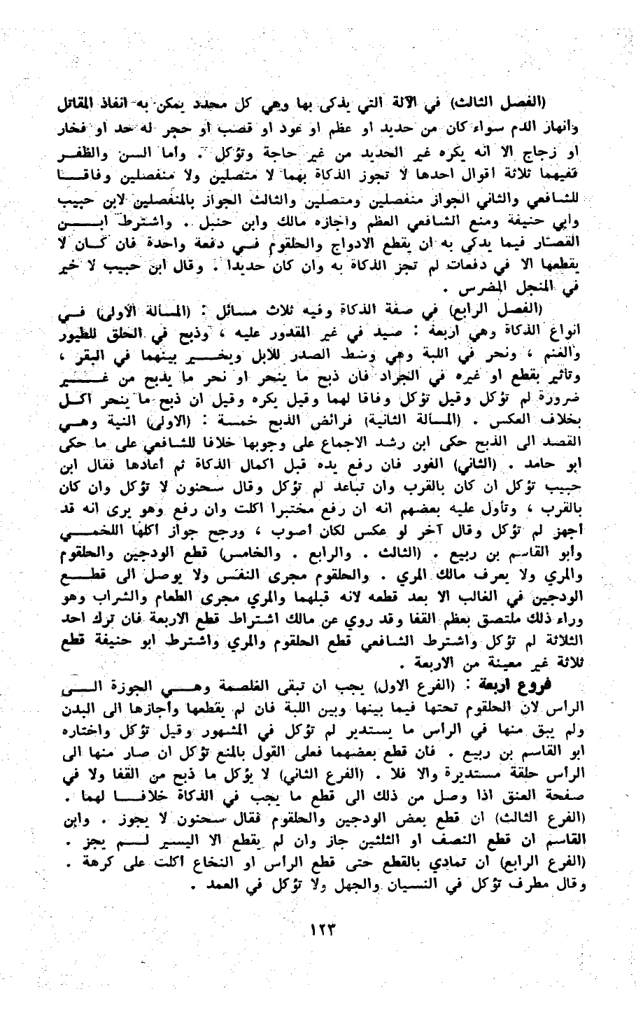 (الْفَصْل الثَّالِث) فِي الْآلَة الَّتِي يذكى بهَا وَهِي كل محدد يُمكن بِهِ إِنْفَاذ الْمقَاتل وإنهار الدَّم سَوَاء كَانَ من حَدِيد أَو عظم أَو عود أَو قصب أَو حجر لَهُ حد أَو فخار أَو زجاج إِلَّا أَنه يكره غير الْحَدِيد من غير حَاجَة وتؤكل وَأما السن وَالظفر ففيهما ثَلَاثَة أَقْوَال أَحدهَا لَا تجوز الذَّكَاة بهما لَا متصلين وَلَا منفصلين وفَاقا للشَّافِعِيّ وَالثَّانِي الْجَوَاز منفصلين ومتصلين وَالثَّالِث الْجَوَاز بالمنفصلين لِابْنِ حبيب وَأبي حنيفَة وَمنع الشَّافِعِي الْعظم وَأَجَازَهُ مَالك وَابْن حَنْبَل وَاشْترط ابْن الْقصار فِيمَا يذكى بِهِ أَن يقطع الأدواج والحلقوم فِي دفْعَة وَاحِدَة فَإِن كَانَ لَا يقطعهَا إِلَّا فِي دفعات لم تجز الذَّكَاة بِهِ وَإِن كَانَ حديدا وَقَالَ ابْن حبيب لَا خير فِي المنجل المضرس (الْفَصْل الرَّابِع) فِي صفة الذَّكَاة وَفِيه ثَلَاث مسَائِل (الْمَسْأَلَة الأولى) فِي أَنْوَاع الذَّكَاة وَهِي أَرْبَعَة صيد فِي غير الْمَقْدُور عَلَيْهِ وَذبح فِي الْحلق للطيور وتأثير بِقطع أَو غَيره فِي الْجَرَاد فَإِن ذبح مَا ينْحَر أَو نحر مَا يذبح من غير ضَرُورَة لم تُؤْكَل وَقيل تُؤْكَل وفَاقا لَهما وَقيل يكره وَقيل أَن ذبح مَا ينْحَر أكل بِخِلَاف الْعَكْس (الْمَسْأَلَة الثَّانِيَة) فَرَائض الذّبْح خَمْسَة (الأولى النِّيَّة وَهِي أَبُو حَامِد (الثَّانِي) الْفَوْر فَإِن رفع يَده قبل إِكْمَال الذَّكَاة ثمَّ أَعَادَهَا فَقَالَ ابْن حبيب تُؤْكَل إِن كَانَ بِالْقربِ وَإِن تبَاعد لم تُؤْكَل وَقَالَ سَحْنُون لَا تُؤْكَل وَإِن كَانَ بِالْقربِ وَتَأَول عَلَيْهِ بَعضهم أَنه إِن رفع مختبرا أكلت وَإِن رفع وَهُوَ يرى أَنه قد أجهز لم تُؤْكَل وَقَالَ آخر لَو عكس لَكَانَ أصوب وَرجح جَوَاز أكلهَا اللَّخْمِيّ وَأَبُو الْقَاسِم بن ربيع (الثَّالِث وَالرَّابِع وَالْخَامِس) قطع الودجين والحلقوم والمري وَلَا يعرف مَالك المري والحلقوم مجْرى النَّفس وَلَا يُوصل إِلَى قطع الودجين فِي الْغَالِب إِلَّا بعد قطعه لِأَنَّهُ قبلهمَا والمري مجْرى الطَّعَام وَالشرَاب وَهُوَ وَرَاء ذَلِك ملتصق بِعظم الْقَفَا وَقد رُوِيَ عَن مَالك اشْتِرَاط قطع الْأَرْبَعَة فَإِن ترك أحد الثَّلَاثَة لم تُؤْكَل وَاشْترط الشَّافِعِي قطع الْحُلْقُوم والمري وَاشْترط أَبُو حنيفَة قطع ثَلَاثَة غير مُعينَة من الْأَرْبَعَة فروع أَرْبَعَة (الْفَرْع الأول) يجب أَن تبقى الغلصمة وَهِي الجوزة إِلَى الرَّأْس لِأَن الْحُلْقُوم تحتهَا فِيمَا بَينهَا وَبَين اللبة فَإِن لم يقطعهَا وأجازها إِلَى الْبدن وَلم يبْق مِنْهَا فِي الرَّأْس مَا يستدير لم تُؤْكَل فِي الْمَشْهُور وَقيل تُؤْكَل وَاخْتَارَهُ أَبُو الْقَاسِم بن ربيع فإنق طع بعضهما فعلى القَوْل بِالْمَنْعِ تُؤْكَل إِن صَار مِنْهَا إِلَى الرَّأْس حَلقَة مستديرة وَإِلَّا فَلَا (الْفَرْع الثَّانِي) لَا يُؤْكَل مَا ذبح من الْقَفَا وَلَا فِي صفحة الْعُنُق إِذا وصل من ذَلِك إِلَى قطع مَا يجب فِي الذَّكَاة خلافًا لَهما (الْفَرْع الثَّالِث (إِن قطع بعض الودجين والحلقوم فَقَالَ سَحْنُون لَا يجوز وَابْن الْقَاسِم إِن قطع النّصْف أَو الثُّلثَيْنِ جَازَ وإم لم يقطع إِلَّا الْيَسِير لم يجز (الْفَرْع الرَّابِع) إِن تَمَادى بِالْقطعِ حَتَّى قطع الرَّأْس أَو النخاع أكلت على كرهة وَقَالَ مطرف تُؤْكَل فِي النسْيَان والجهال وَلَا تُؤْكَل فِي الْعمد