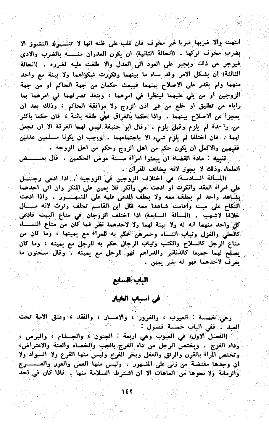 وَهِي خَمْسَة الْعُيُوب والغرور والاعسار والفقد وَعتق الْأمة تَحت العَبْد فَفِي الْبَاب خَمْسَة فُصُول (الْفَصْل الأول) فِي الْعُيُوب وَهِي أَرْبَعَة الْجُنُون والجذام والبرص وداء الْفرج وَيخْتَص الرجل من دَاء الْفرج بالجب والخصاء والعنة والاعتراض وتختص الْمَرْأَة بالقرن والرتق والعفل وبخر الْفرج وَلَيْسَ مِنْهَا القرع وَلَا السوَاد وَلَا إِن وجدهَا مفتضة من زنى على الْمَشْهُور وَلَيْسَ مِنْهَا الْعَمى والعور وَالْعَرج والزمانة وَلَا نَحْوهَا من العاهات إِلَّا أَن اشْترط السَّلامَة مِنْهَا فَإِذا كَانَ فِي أحد