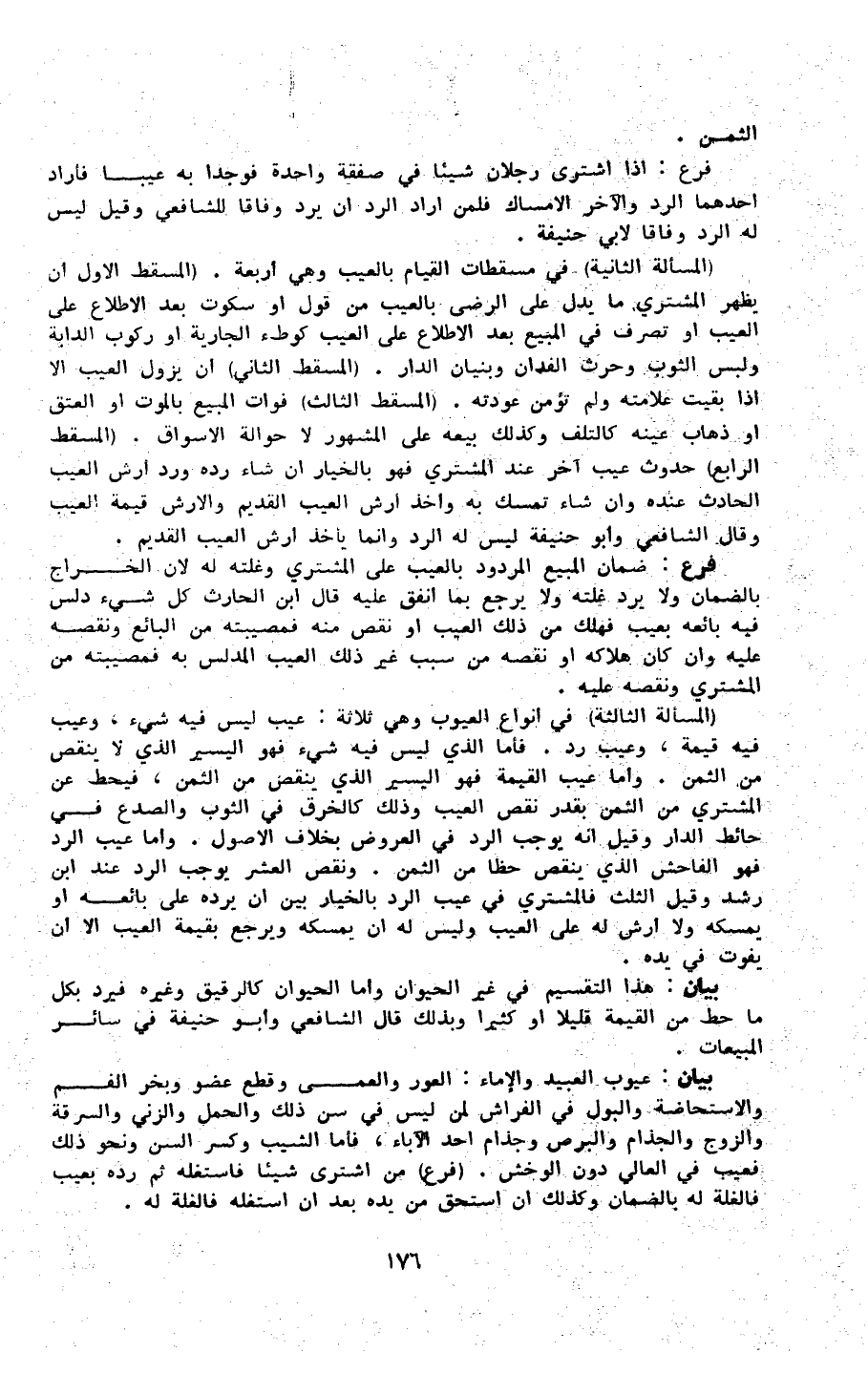 الثّمن فرع إِذا اشْترى رجلَانِ شَيْئا فِي صَفْقَة وَاحِدَة فوجدا بِهِ عَيْبا فَأَرَادَ أَحدهمَا الرَّد وَالْآخر الْإِمْسَاك فَلِمَنْ أَرَادَ الرَّد أَن يرد وفَاقا للشَّافِعِيّ وَقيل لَيْسَ لَهُ الرَّد وفَاقا لأبي حنيفَة (الْمَسْأَلَة الثَّانِيَة) فِي مسقطات الْقيام بِالْعَيْبِ وَهِي أَرْبَعَة (الْمسْقط الأول) أَن يظْهر المُشْتَرِي مايدل على الرضى بِالْعَيْبِ من قَول أَو سكُوت بعد الِاطِّلَاع على الْعَيْب أَو تصرف فِي الْمَبِيع بعد الِاطِّلَاع على الْعَيْب كَوَطْء الْجَارِيَة أَو ركُوب الدَّابَّة وَلبس الثَّوْب وحرث الفدان وبنيان الدَّار (الْمسْقط الثَّانِي) أَن يَزُول الْعَيْب إِلَّا إِذا بقيت علامته وَلم تؤمن عودته (الْمسْقط الثَّالِث) فَوَات الْمَبِيع بِالْمَوْتِ أَو الْعتْق أَو ذهَاب عينه كالتلف وَكَذَلِكَ بَيْعه على الْمَشْهُور لَا حِوَالَة الْأَسْوَاق (الْمسْقط الرَّابِع) حُدُوث عيب آخر عِنْد المُشْتَرِي فَهُوَ بِالْخِيَارِ إِن شَاءَ رده ورد أرش الْعَيْب الْحَادِث عِنْده وَإِن شَاءَ تمسك بِهِ وَأخذ أرش الْعَيْب الْقَدِيم وَالْأَرْش قيمَة الْعَيْب وَقَالَ الشَّافِعِي وَأَبُو حنيفَة لَيْسَ لَهُ الرَّد وَإِنَّمَا يَأْخُذ أرش الْعَيْب الْقَدِيم فرع ضَمَان الْمَبِيع الْمَرْدُود بِالْعَيْبِ على المُشْتَرِي وغلته لَهُ لِأَن الْخراج بِالضَّمَانِ وَلَا يرد غَلَّته وَلَا يرجع بِمَا أنْفق عَلَيْهِ قَالَ ابْن الْحَارِث كل شَيْء دلّس فِيهِ بَائِعه بِعَيْب فَهَلَك من ذَلِك الْعَيْب أَو نقص مِنْهُ فمصيبته من البَائِع ونقصه عَلَيْهِ وَإِن كَانَ هَلَاكه أَو نَقصه من سَبَب غير ذَلِك الْعَيْب المدلس بِهِ فمصيبته من المُشْتَرِي ونقصه عَلَيْهِ (الْمَسْأَلَة الثَّالِثَة) فِي أَنْوَاع الْعُيُوب وَهِي ثَلَاثَة عيب لَيْسَ فِيهِ شَيْء وعيب فِيهِ قيمَة وعيب رد فَأَما الَّذِي لَيْسَ فِيهِ شَيْء فَهُوَ الْيَسِير الَّذِي لَا ينقص من الثّمن وَأما عيب الْقيمَة فَهُوَ الْيَسِير الَّذِي ينقص من الثّمن فيحط عَن المُشْتَرِي من الثّمن بقد نقص الْعَيْب وَذَلِكَ كالخرق فِي الثَّوْب والصدع فِي حَائِط الدَّار وَقيل أَنه يُوجب الرَّد فِي الْعرُوض بِخِلَاف الأصور وَأما عيب الرَّد فَهُوَ الْفَاحِش الَّذِي ينقص حظا من الثّمن وَنقص الْعشْر يُوجب الرَّد عِنْد ابْن رشد وَقيل الثُّلُث فَالْمُشْتَرِي فِي عيب الرَّد بِالْخِيَارِ بَين أَن يردهُ على بَائِعه أَو يمسِكهُ وَلَا أرش لَهُ على الْعَيْب وَلَيْسَ لَهُ أَن يمسِكهُ وَيرجع بِقِيمَة الْعَيْب إِلَّا أَن يفوت فِي يَده بَيَان هَذَا التَّقْسِيم فِي غير الْحَيَوَان وَأما الْحَيَوَان كالرقيق وَغَيره فَيرد بِكُل مَا حط من الْقيمَة قَلِيلا أَو كثيرا وَبِذَلِك قَالَ الشَّافِعِي وَأَبُو حنيفَة فِي سَائِر المبيعات بَيَان عُيُوب العبيد وَالْإِمَاء العور والعمى وَقطع عُضْو وبخر الْفَم والاستحاضة وَالْبَوْل فِي الْفراش لمن لَيْسَ فِي سنّ ذَلِك وَالْحمل والزنى وَالسَّرِقَة وَالزَّوْج والجذام والبرص وجذام أحد الْآبَاء فَأَما الشيب وَكسر السن وَنَحْو ذَلِك فعيب فِي العالي دون الوخش (فرع) من اشْترى شَيْئا فاستغله ثمَّ رده بِعَيْب فالغلة لَهُ بِالضَّمَانِ وَكَذَلِكَ أَن اسْتحق من يَده بعد أَن استغله فالغلة لَهُ