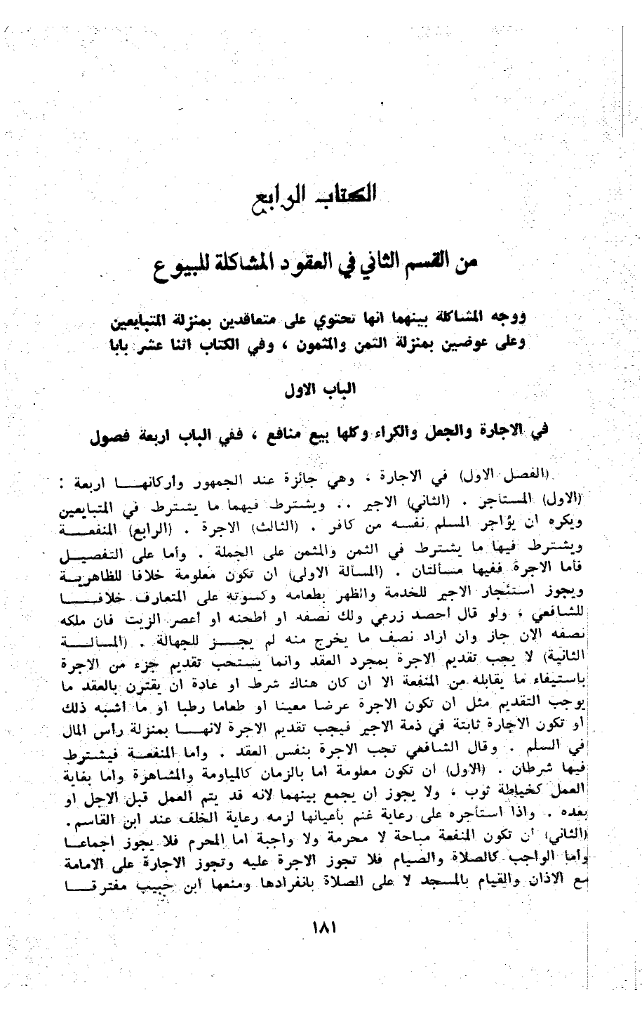 الْبَاب الأول فِي الْإِجَارَة والجعل والكراء وَكلهَا بيع مَنَافِع فَفِي الْبَاب أَرْبَعَة فُصُول