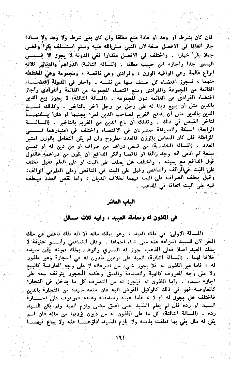 (الْمَسْأَلَة الأولى) فِي ملك العَبْد وَهُوَ يملك مَاله إِلَّا أَنه ملك نَاقص عَن ملك الْحر لِأَن للسَّيِّد انْتِزَاعه عَنهُ مَتى شَاءَ إِجْمَاعًا وَقَالَ الشَّافِعِي وَأَبُو حنيفَة لَا يملك العَبْد أصلا فعلى الْمَذْهَب يجوز لَهُ التَّسَرِّي وَالْوَطْء بِملك يَمِينه بِإِذن سَيّده خلافًا لَهما (الْمَسْأَلَة الثَّانِيَة) العَبْد على نَوْعَيْنِ مَأْذُون لَهُ فِي التِّجَارَة وَغير مَأْذُون لَهُ فَأَما غير الْمَأْذُون لَهُ فَلَا يجوز شَيْء من تصرافاته لَا على وَجه الْمُعَارضَة كَالْبيع وَلَا على وَجه الْمَعْرُوف كَالْهِبَةِ وَالصَّدَََقَة وَالْعِتْق وَحكمه الْمَحْجُور يتَوَقَّف بَيْعه على إجَازَة سَيّده وَأما الْمَأْذُون لَهُ فَيجوز لَهُ من التَّصَرُّف كل مَا يدْخل فِي التِّجَارَة كالمعاوضة فَهُوَ فِي ذَلِك كَالْوَكِيلِ الْمُفَوض إِلَيْهِ فَإِن مَنعه سَيّده من التِّجَارَة بِالدّينِ فَاخْتلف هَل يجوز لَهُ أم لَا فَأَما هِبته وصدقته وعتقه فموقوف على إجَازَة السَّيِّد أَو رده فَإِن لم يعلم السَّيِّد حَتَّى أعتق مضى وَلزِمَ العَبْد وَلم يكن للسَّيِّد رده (الْمَسْأَلَة الثَّالِثَة) كل مَا على الْمَأْذُون لَهُ من دُيُون يُؤَدِّيهَا من مَاله فَإِن لم يكن لَهُ مَال يَفِي بهَا تعلّقت بِذِمَّتِهِ وَلَا يلْزم السَّيِّد أَدَاؤُهَا عَنهُ وَلَا يُبَاع فِيهَا