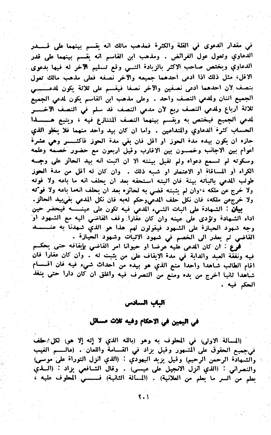 فِي مِقْدَار الدَّعْوَى فِي الْقلَّة وَالْكَثْرَة فمذهب مَالك أَنه يقسم بَينهمَا على قدر الدعاوي وتعول عول الْفَرَائِض وَمذهب ابْن الْقَاسِم أَنه يقسم بَينهمَا على قدر الدعاوي وَيخْتَص صَاحب الْأَكْثَر بِالزِّيَادَةِ الَّتِي وَقع تَسْلِيم الآخر لَهُ فِيهَا بِدَعْوَى الْأَقَل مثل ذَلِك إِذا ادّعى أَحدهمَا جَمِيعه وَالْآخر نصفه فعلى مَذْهَب مَالك تعول بِنصْف لِأَن أَحدهمَا ادّعى نِصْفَيْنِ وَالْآخر نصفا فَيقسم على ثَلَاثَة يكون لمُدعِي الْجَمِيع اثْنَان ولمدعي النّصْف وَاحِد وعَلى مَذْهَب ابْن الْقَاسِم يكون لمُدعِي الْجَمِيع ثَلَاثَة أَربَاع ولمدعي النّصْف ربع لِأَن مدعي النّصْف قد سلم فِي النّصْف الآخر لمُدعِي الْجَمِيع فَيخْتَص بِهِ وَيقسم بَينهمَا النّصْف الْمُتَنَازع فِيهِ وَيتبع هَذَا الْحساب كَثْرَة الدعاوي والمتداعين وَأما إِن كَانَ بيد وَاحِد مِنْهُمَا فَلَا يَخْلُو الَّذِي حازه أَن يكون بِيَدِهِ مُدَّة الْحَوْز أَو أقل فَإِن بَقِي مُدَّة الْحَوْز فَأكْثر وَهِي عشرَة أَعْوَام بَين الْأَجَانِب وَخَمْسُونَ بَين الْأَقَارِب وَقيل أَرْبَعُونَ مَعَ حُضُور خَصمه وَعلمه وسكوته لم تسمع دَعْوَاهُ وَلم تقبل بَينته إِلَّا إِن أثبت أَنه بيد الْحَائِز على وَجه الْكِرَاء أَو الْمُسَاقَاة أَو الإعتمار أَو شبه ذَلِك وَأَن كَانَ لَهُ أقل من مُدَّة الْحَوْز طُولِبَ الْمُدَّعِي بإثباته بَيِّنَة فَإِن أثْبته اسْتَحَقَّه بعد أَن يحلف أَنه مَا بَاعه وَلَا فَوته وَلَا خرج عَن ملكه وَإِن لم يُثبتهُ قضي بِهِ لحائزه بعد أَن يحلف أَنه مَا بَاعه وَلَا فَوته وَلَا خرج عَن ملكه فَإِن نكل حلف الْمُدَّعِي وَحكم لَهُ بِهِ فَإِن نكل الْمُدَّعِي بَقِي بيد الْحَائِز بَيَان الشَّهَادَة على إِثْبَات الشَّيْء الْمُدَّعِي فِيهِ تكون على عينه فيحضر حِين أَدَاء الشَّهَادَة وتؤدى على عينه وَإِن كَانَ عقارا وقف القَاضِي إِلَيْهِ مَعَ الشُّهُود أَو وَجه شُهُود الْحِيَازَة على الشُّهُود فَيَقُولُونَ لَهُم هَذَا هُوَ الَّذِي شَهِدنَا بِهِ عِنْد القَاضِي ثمَّ يعْذر غلى الْخصم فِي شُهُود الْإِثْبَات وشهود الْحِيَازَة فرع إِن كَانَ الْمُدعى عَلَيْهِ عرضا أَو حَيَوَانا أَمر القَاضِي بإيقافه حَتَّى يحكم فِيهِ وَنَفَقَة العَبْد وَالدَّابَّة فِي مُدَّة الإيقاف على من يثبت لَهُ وَإِن كَانَ عقارا فَإِن أَقَامَ الطَّالِب شَاهدا وَاحِدًا منع الَّذِي هُوَ بِيَدِهِ من إِحْدَاث شَيْء فِيهِ فَإِن أَقَامَ شَاهدا ثَانِيًا أخرج من يَده وَمنع من التَّصَرُّف فِيهِ وأغلق إِن كَانَ دَارا حَتَّى ينفذ الحكم فِيهِ