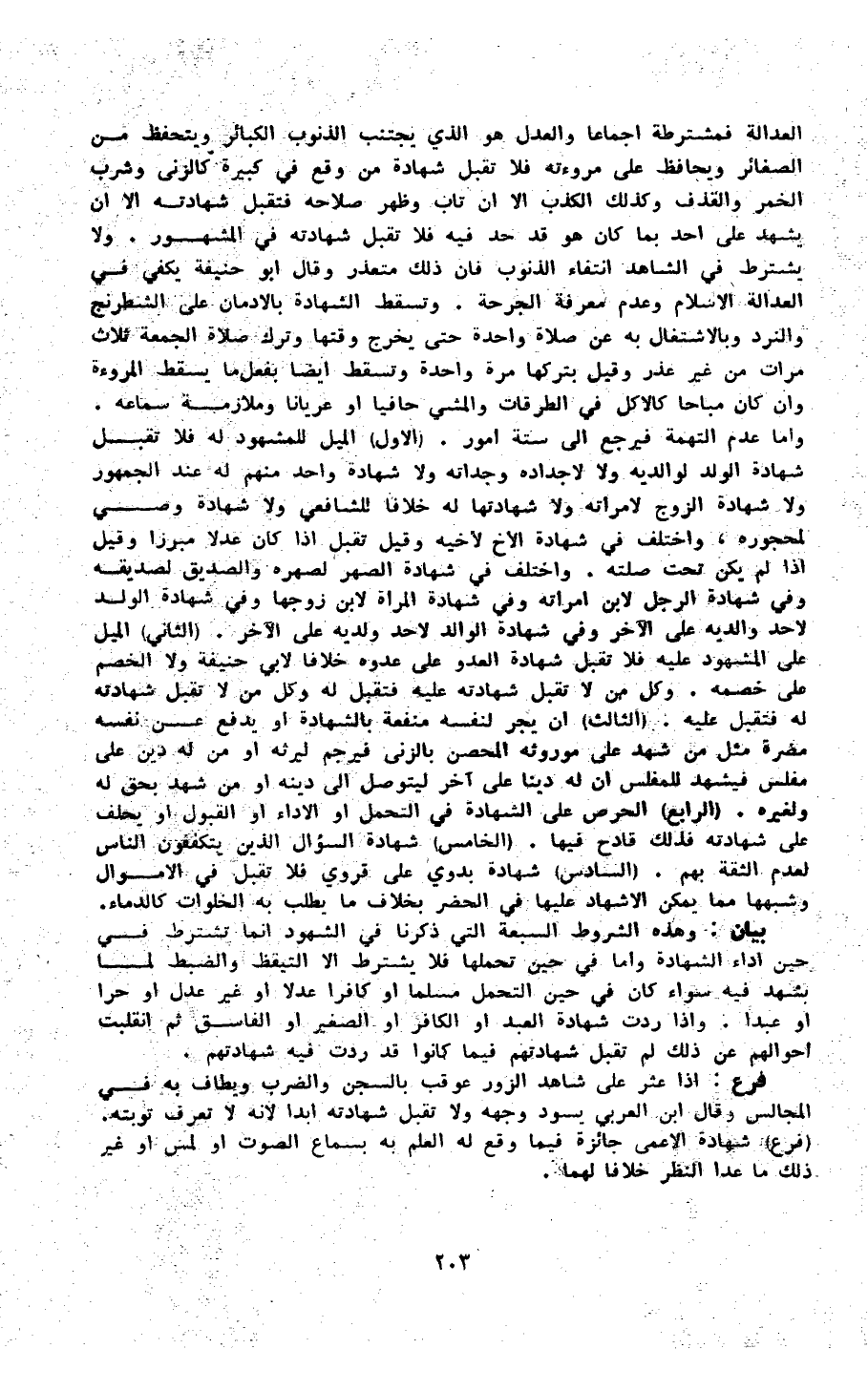 الْعَدَالَة فمشترطة إِجْمَاعًا وَالْعدْل هُوَ الَّذِي يجْتَنب الذُّنُوب الْكَبَائِر ويتحفظ من الصَّغَائِر ويحافظ على مروءته فَلَا تقبل شَهَادَة من وَقع فِي كَبِيرَة كالزنى وَشرب الْخمر وَالْقَذْف وَكَذَلِكَ الْكَذِب إِلَّا إِن تَابَ وَظهر صَلَاحه فَتقبل شَهَادَته إِلَّا أَن يشْهد على أحد بِمَا كَانَ هُوَ قد حد فِيهِ فَلَا تقبل شَهَادَته فِي الْمَشْهُور وَلَا يشْتَرط فِي الشَّاهِد انْتِفَاء الذُّنُوب فَإِن ذَلِك مُتَعَذر وَقَالَ أَبُو حنيفَة يَكْفِي فِي الْعَدَالَة الْإِسْلَام وَعدم معرفَة الجرحة وَتسقط الشَّهَادَة بالإدمان على الشطرنج والنرد وبالإشتغال بِهِ عَن صَلَاة وَاحِدَة حَتَّى يخرج وَقتهَا وَترك صَلَاة الْجُمُعَة ثَلَاث مَرَّات من غير عذر وَقيل بِتَرْكِهَا مرّة وَاحِدَة وَتسقط أَيْضا بِفعل مَا يسْقط الْمُرُوءَة وَإِن كَانَ مُبَاحا كَالْأَكْلِ فِي الطرقات وَالْمَشْي حافيا أَو عُريَانا وملازمة سَمَاعه وَأما عدم التُّهْمَة فَيرجع إِلَى سِتَّة أُمُور (الأول) الْميل للْمَشْهُود لَهُ فَلَا تقبل شَهَادَة الْوَلَد لوَالِديهِ وَلَا لأجداده وجداته وَلَا شَهَادَة وَاحِد مِنْهُم لَهُ عِنْد الْجُمْهُور وَلَا شَهَادَة الزَّوْج لامْرَأَته وَلَا شهادتها لَهُ خلافًا للشَّافِعِيّ وَلَا شَهَادَة وَصِيّ لمحجوره وَاخْتلف فِي شَهَادَة الْأَخ لِأَخِيهِ وَقيل تقبل إِذا كَانَ عدلا مبرزا وَقيل إِذا لم يكن تَحت صلته وَاخْتلف فِي شَهَادَة الصهر لصهره وَالصديق لصديقه وَفِي شَهَادَة الرجل لِابْنِ امْرَأَته وَفِي شَهَادَة الْمَرْأَة لِابْنِ زَوجهَا وَفِي شَهَادَة الْوَلَد لأحد وَالِديهِ على الآخر وَفِي شَهَادَة الْوَالِد لأحد ولديه على الآخر (الثَّانِي) الْميل على الْمَشْهُود عَلَيْهِ فَلَا تقبل شَهَادَة الْعَدو على عدوه خلافًا لأبي حنيفَة وَلَا الْخصم على خَصمه وكل من لَا تقبل شَهَادَته عَلَيْهِ فَتقبل لَهُ وكل من لاتقبل شَهَادَته لَهُ فَتقبل عَلَيْهِ (الثَّالِث) أَن يجر لنَفسِهِ مَنْفَعَة بِالشَّهَادَةِ أَو يدْفع عَن نَفسه مضرَّة مثل من شهد على موروثه الْمُحصن بالزنى فيرجم ليرثه أَو من لَهُ دين على مُفلس فَيشْهد للْمُفلس أَن لَهُ دينا على آخر ليتوصل غلى دينه أَو من شهد بِحَق لَهُ وَلغيره (الرَّابِع) الْحِرْص على الشَّهَادَة فِي التَّحَمُّل أَو الْأَدَاء أَو الْقبُول أَو يحلف على شَهَادَته فَذَلِك قَادِح فِيهَا (الْخَامِس) شَهَادَة السُّؤَال الَّذين يَتَكَفَّفُونَ النَّاس لعدم الثِّقَة بهم 0 (السَّادِس) شَهَادَة بدوي على قروي فَلَا تقبل فِي الْأَمْوَال وَشبههَا مِمَّا يُمكن الْإِشْهَاد عَلَيْهَا فِي الْحَضَر بِخِلَاف مَا يطْلب بِهِ الخلوات كالدماء بَيَان وَهَذِه الشُّرُوط السَّبْعَة الَّتِي ذكرنَا فِي الشُّهُود إِنَّمَا تشْتَرط فِي حِين أَدَاء الشَّهَادَة وَأما فِي حِين تحملهَا فَلَا يشْتَرط إِلَّا التيقظ والضبط لما يشْهد فِيهِ سَوَاء كَانَ فِي حِين التَّحَمُّل مُسلما أَو كَافِرًا عدلا أَو غير عدل أَو حرا أَو عبدا وَإِذا ردَّتْ شَهَادَة العَبْد أَو الْكَافِر أَو الصَّغِير أَو الْفَاسِق ثمَّ انقلبت أَحْوَالهم عَن ذَلِك لم تقبل شَهَادَتهم فِيمَا كَانُوا قد ردَّتْ فِيهِ شَهَادَتهم فرع إِذا عثر على شَاهد الزُّور عُوقِبَ بالسجن وَالضَّرْب وَيُطَاف بِهِ فِي الْمجَالِس وَقَالَ ابْن الْعَرَبِيّ يسود وَجهه وَلَا تقبل شَهَادَته أبدا لِأَنَّهُ لَا تعرف تَوْبَته (فرع) شَهَادَة الْأَعْمَى جَائِزَة فِيمَا وَقع لَهُ الْعلم بِهِ بِسَمَاع الصَّوْت أَو لمس أَو غير ذَلِك مَا عدا النّظر خلافالهما