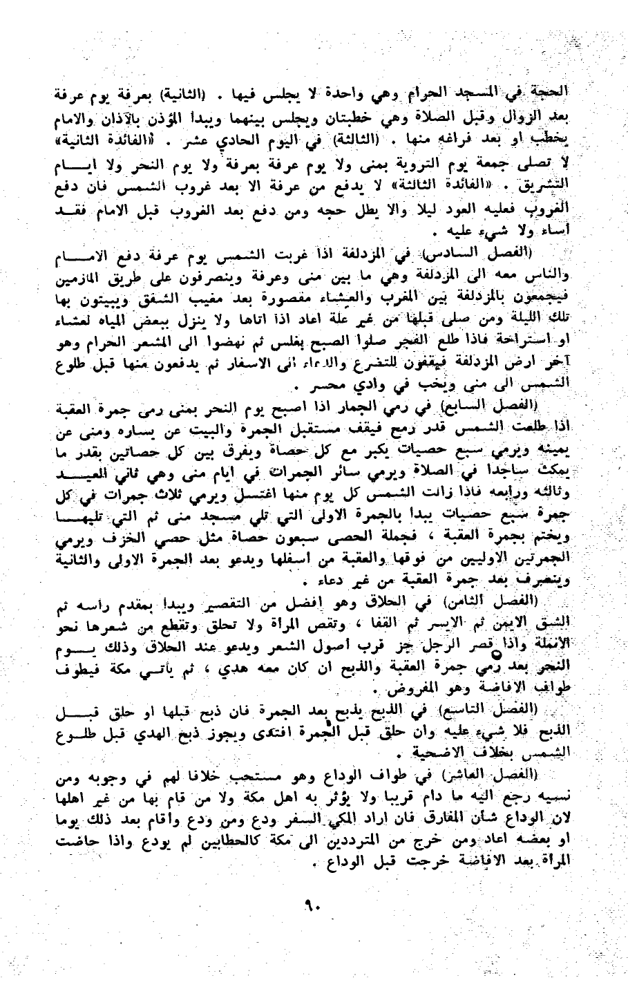 الْحجَّة فِي الْمَسْجِد الْحَرَام وَهِي وَاحِدَة لَا يجلس فِيهَا (الثَّانِيَة) بِعَرَفَة يَوْم عَرَفَة بعد الزَّوَال وَقبل الصَّلَاة وَهِي خطبتان وَيجْلس بَينهمَا وَيبدأ الْمُؤَذّن بالآذان وَالْإِمَام يخْطب أَو بعد فَرَاغه مِنْهَا (الثَّالِثَة) فِي الْيَوْم الْحَادِي عشر ((الْفَائِدَة الثَّانِيَة)) لَا تصلى جُمُعَة يَوْم التَّرويَة بمنى وَلَا يَوْم عَرَفَة بِعَرَفَة وَلَا يَوْم النَّحْر وَلَا أَيَّام التَّشْرِيق ((الْفَائِدَة الثَّالِثَة)) لَا يدْفع من عَرَفَة إِلَّا بعد غرُوب المشس فَإِن دفع الْغُرُوب فَعَلَيهِ الْعود لَيْلًا وَإِلَّا يبطل حجه وَمن دفع بعد الْغُرُوب قبل الإِمَام فقد أَسَاءَ وَلَا شَيْء عَلَيْهِ (الْفَصْل السَّادِس) فِي الْمزْدَلِفَة إِذا غربت الشَّمْس يَوْم عَرَفَة دفع الإِمَام وَالنَّاس مَعَه إِلَى الْمزْدَلِفَة وَهِي مَا بَين منى وعرفة وينصرفون على طَرِيق المازمين فَيجْمَعُونَ بِالْمُزْدَلِفَةِ بَين الْمغرب وَالْعشَاء مَقْصُورَة بعد مغيب الشَّفق ويبيتون بهَا تِلْكَ اللَّيْلَة وَمن صلى قبلهَا من غير عِلّة أعَاد إِذا أَتَاهَا وَلَا ينزل بِبَعْض الْمِيَاه لعشاء أَو استراحة فَإِذا طلع الْفجْر صلوا الصُّبْح بِغَلَس ثمَّ نهضوا إِلَى الْمشعر الْحَرَام وَهُوَ آخر أَرض الْمزْدَلِفَة فيقفون للتضرع وَالدُّعَاء إِلَى الْأَسْفَار ثمَّ يدْفَعُونَ مِنْهَا قبل طُلُوع الشَّمْس إِلَى منى ويخب فِي وَادي محسر (الْفَصْل السَّابِع) فِي رمي الْجمار إِذا أصبح يَوْم النَّحْر بمنى رمى جَمْرَة الْعقبَة إِذا طلعت الشَّمْس قدر رمح فيقف مُسْتَقْبل الْجَمْرَة وَالْبَيْت عَن يسَاره وَمنى عَن يَمِينه وَيَرْمِي سبع حَصَيَات يكبر مَعَ كل حَصَاة وَيفرق بَين كل حصاتين بِقدر مَا يمْكث سَاجِدا فِي الصَّلَاة وَيَرْمِي سَائِر الجمرات فِي أَيَّام منى وَهِي ثَانِي الْعِيد وثالثه ورابعه فَإِذا زَالَت الشَّمْس كل يَوْم مِنْهَا اغْتسل وَيَرْمِي ثَلَاث جمرات فِي كل جرة سبع حَصَيَات يبْدَأ بالجمرة الأولى الَّتِي تلِي مَسْجِد منى ثمَّ الَّتِي تَلِيهَا وَيخْتم بجمرة الْعقبَة فجملة الْحَصَى سَبْعُونَ حَصَاة مثل حَصى الخزف وَيَرْمِي الْجَمْرَتَيْن والأوليين من فَوْقهَا والعقبة من أَسْفَلهَا وَيَدْعُو بعد الْجَمْرَة الأولى وَالثَّانيَِة وينصرف بعد جَمْرَة الْعقبَة من غير دُعَاء (الْفَصْل الثَّامِن) فِي الحلاق وَهُوَ أفضل من التَّقْصِير وَيبدأ بِمقدم رَأسه ثمَّ الشق الْأَيْمن ثمَّ الْأَيْسَر ثمَّ الْقَفَا وتقص الْمَرْأَة وَلَا تحلق وتقطع من شعرهَا نَحْو الْأُنْمُلَة وَإِذا قصر الرجل جز قرب أصُول الشّعْر وَيَدْعُو عِنْد الحلاق وَذَلِكَ يَوْم النَّحْر بعد رمي جَمْرَة الْعقبَة وَالذّبْح إِن كَانَ مَعَه هدي ثمَّ يَأْتِي مَكَّة فيطوف طواف الْإِفَاضَة وَهُوَ الْمَفْرُوض (الْفَصْل التَّاسِع) فِي الذّبْح يذبح بعد الْجَمْرَة فَإِن ذبح قبلهَا أَو حلق قبل الذّبْح فَلَا شَيْء عَلَيْهِ وَإِن حلق بل الْجَمْرَة افتدى وَيجوز ذبح الْهَدْي قبل طُلُوع الشَّمْس بِخِلَاف الْأُضْحِية (الْفَصْل الْعَاشِر) فِي طواف الْوَدَاع وَهُوَ مُسْتَحبّ خلافًا لَهُم فِي وُجُوبه وَمن نَسيَه رَجَعَ إِلَيْهِ مَا دَامَ قَرِيبا وَلَا يُؤثر بِهِ أهل مَكَّة وَلَا من قَامَ بهَا من غير أَهلهَا لِأَن الْوَدَاع شَأْن المفارق فَإِن أَرَادَ الْمَكِّيّ السّفر ودع وَمن ودع وَأقَام بعد ذَلِك يَوْمًا أَو بعضه أعَاد وَمن خرج من المترددين إِلَى مَكَّة كالحطابين لم يودع وَإِذا حَاضَت الْمَرْأَة بعد الْإِفَاضَة خرجت قبل الْوَدَاع