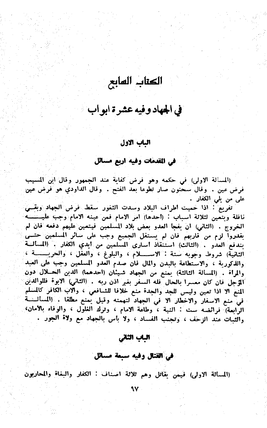الْبَاب الثَّانِي فِي الْقِتَال وَفِيه سَبْعَة مسَائِل