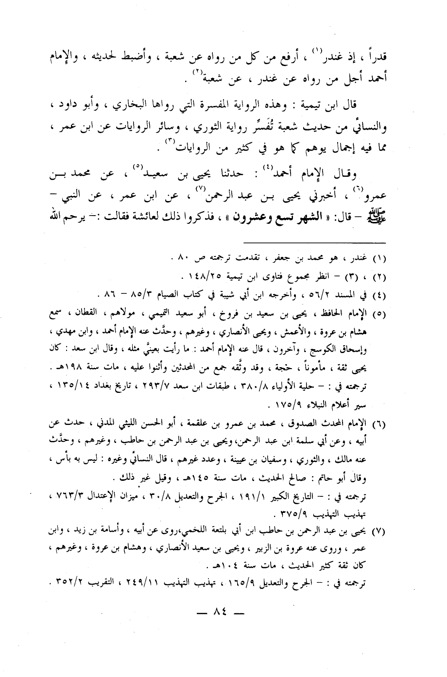 وقال الإمام أحمد4: حدثنا يحيى بن سعيد5، عن محمد بن عمرو6، أخبرني يحيى بن عبد الرحمن7، عن ابن عمر، عن النبي صلى الله عليه وسلم قال: الشهر تسع وعشرون"، فذكروا ذلك لعائشة فقالت: يرحم الله