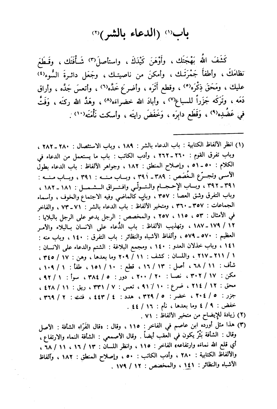 كشف الله بهجتك وأوهن كيدك واستأصل شأفتك وَقطع نظامك وأطفأ جمرتك وَأمكن من ناصيتك وَجعل دَائِرَة السوء عَلَيْك ومحق ذكره وَقطع أَثَره وأضرع خَدّه واتعس جده واراق دَمه وَتَركه جزرا للسباع وأباد الله خضراءه وهد الله رُكْنه وفت فِي عضده وَقطع دابره وخفض رايته وأسكت نأمته