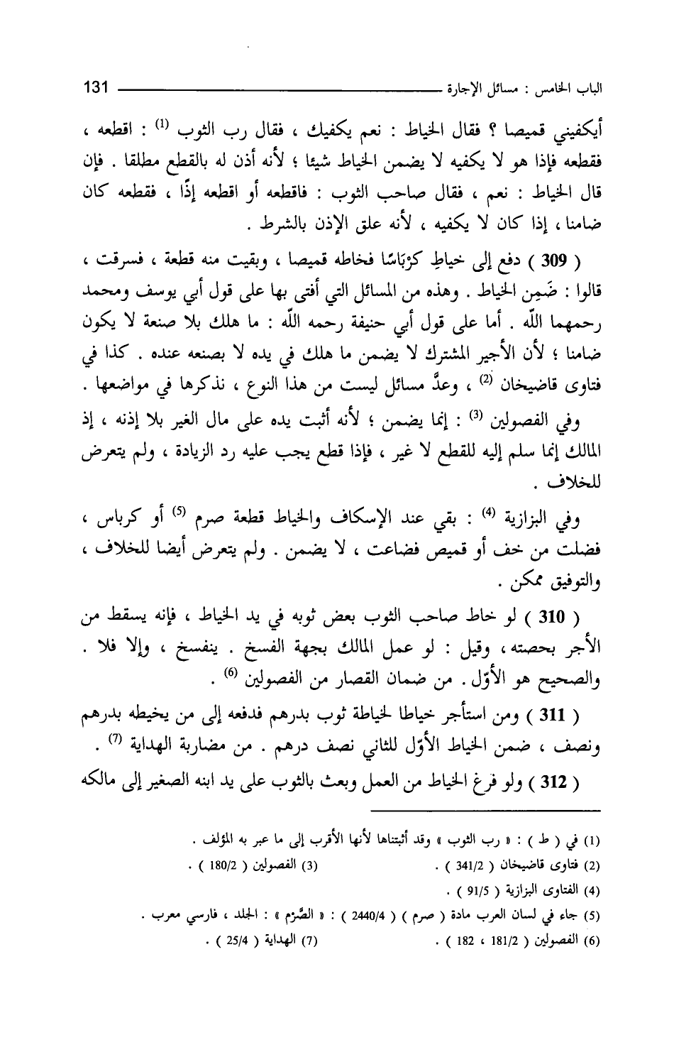 أيكفيني قميصا فقال الخياط نعم يكفيك فقال رب الثوب اقطعه فقطعه فإذا هو لا يكفيه لا يضمن الخياط شيئا لأنه أذن له بالقطع مطلقا فإن قال الخياط نعم فقال صاحب الثوب فاقطعه أو اقطعه إذا فقطعه كان ضامنا إذا كان لا يكفيه لأنه علق الإذن بالشرط دفع إلى خياط كرباسا فخاطه قميصا وبقيت منه قطعة فسرقت قالوا ضمن الخياط وهذه من المسائل التي أفتي بها على قول أبي يوسف ومحمد أما على قول أبي حنيفة ما هلك بلا صنعه لا يكون ضامنا لأن الأجير المشترك لا يضمن ما هلك في يده لا بصنعه عنده كذا في فتاوى قاضي خان وعد مسائل ليست من هذا النوع نذكرها في مواضعها وفي الفصولين إنما يضمن لأنه أثبت يده على مال الغير بلا إذنه إذ المالك إنما سلم إليه للقطع لا غير فإذا قطع يجب عليه رد الزيادة ولم يتعرض للخلاف وفي البزازية بقي عند الإسكاف والخياط قطعة صرم أو كرباس فضلت من خف أو قميص فضاعت لا يضمن ولم يتعرض أيضا للخلاف والتوفيق ممكن لو خاط صاحب الثوب بعض ثوبه في يد الخياط فإنه يسقط من الأجر بحصته وقيل لو عمل المالك بجهة الفسخ ينفسخ وإلا فلا والصحيح هو الأول من ضمان القصار. من الفصولين. ومن استأجر خياطا لخياطة ثوب بدرهم فدفعه إلى من يخيطه بدرهم ونصف ضمن الخياط الأول للثاني نصف درهم من مضاربة الهداية لو فرغ الخياط من العمل وبعث بالثوب على يد ابنه الصغير إلى مالكه