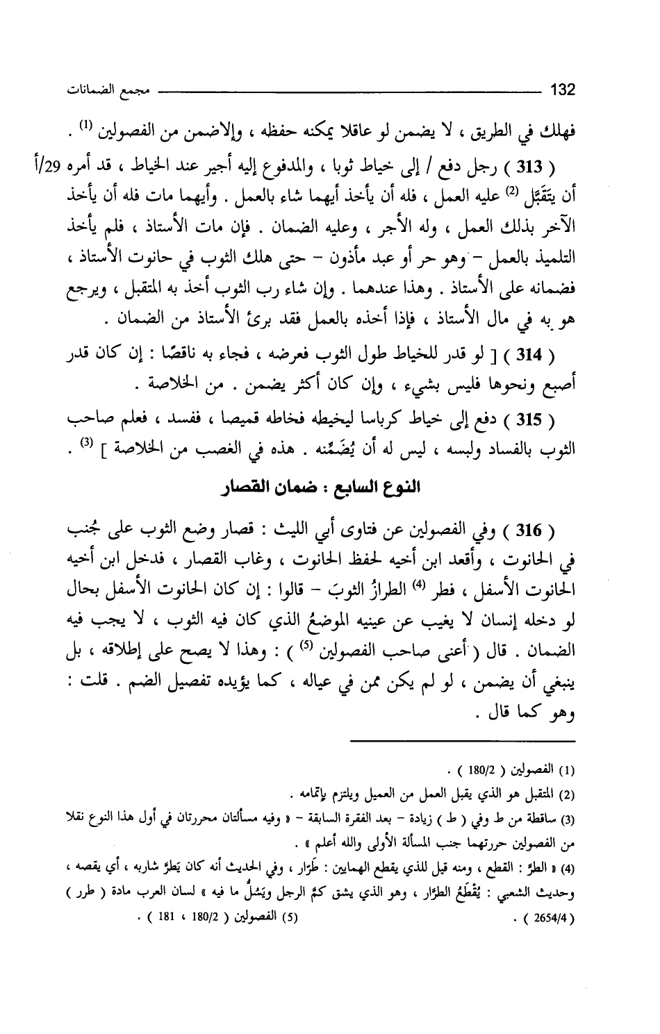 فهلك في الطريق لا يضمن لو عاقلا يمكنه حفظه وإلا ضمن. من الفصولين. رجل دفع إلى خياط ثوبا والمدفوع إليه أجير عند الخياط قد أمره أن يتقبل عليه العمل فله أن يأخذ أيهما شاء بالعمل وأيهما مات فله أن يأخذ الآخر بذلك العمل وله الأجر وعليه الضمان فإن مات الأستاذ فلم يأخذ التلميذ بالعمل وهو حر أو عبد مأذون حتى هلك الثوب في حانوت الأستاذ فضمانه على الأستاذ وهذا عندهما وإن شاء رب الثوب أخذ به المتقبل ويرجع هو به في مال الأستاذ فإذا أخذ بالعمل فقد برئ الأستاذ من الضمان وفيه مسألتان محررتان في أول هذا النوع نقلا. من الفصولين. حررتهما جنب المسألة الأولى والله أعلم النوع السابع ضمان القصار وفي الفصولين عن فتاوى أبي الليث قصار وضع الثوب على جب في الحانوت وأقعد ابن أخيه لحفظ الحانوت وغاب القصار فدخل ابن أخيه الحانوت الأسفل فطر الطرار الثوب قالوا إن كان الحانوت الأسفل بحال لو دخله إنسان لا يغيب عن عينيه الموضع الذي كان فيه الثوب لا يجب فيه الضمان قال أعني صاحب الفصولين وهذا لا يصح على إطلاقه بل ينبغي أن يضمن لو لم يكن ممن في عياله كما يؤيده تفصيل الضم قلت وهو كما قال