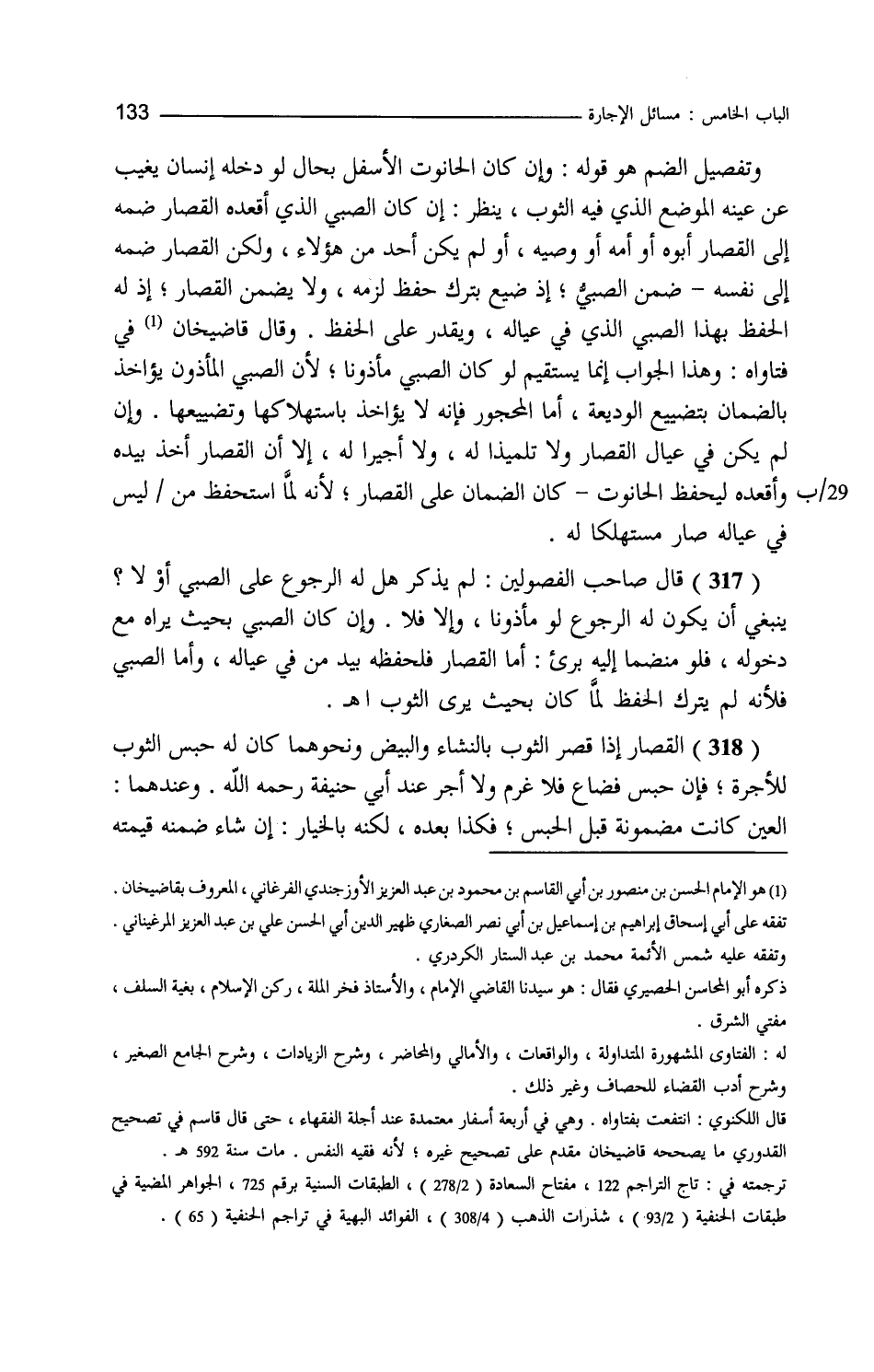 وتفصيل الضم هو قوله وإن كان الحانوت الأسفل بحال لو دخله إنسان يغيب عن عينه الموضع الذي فيه الثوب ينظر إن كان الصبي الذي أقعده القصار ضمنه إلى القصار أبوه أو أمه أو وصيه أو لم يكن أحد من هؤلاء ولكن القصار ضمنه إلى نفسه ضمن الصبي إذ ضيع بترك حفظ لزمه ولا يضمن القصار إذ له الحفظ بهذا الصبي الذي في عياله ويقدر على الحفظ وقال قاضي خان في فتاواه وهذا الجواب إنما يستقيم لو كان الصبي مأذونا لأن الصبي المأذون يؤاخذ بالضمان بتضييع الوديعة أما المحجور فإنه لا يؤاخذ بالاستهلاك له وتضييعها وإن لم يكن في عيال القصار ولا تلميذا له ولا أجيرا له إلا أن القصار أخذ بيده وأقعده ليحفظ الحانوت كان الضمان على القصار لأنه لما استحفظ من ليس في عياله صار مستهلكا له قال صاحب الفصولين لم يذكر هل له الرجوع على الصبي أو لا ينبغي أن يكون له الرجوع لو مأذونا وإلا فلا وإن كان الصبي بحيث يراه مع دخوله فلو منضما إليه برئا أما القصار فلحفظه بيد من في عياله وأما الصبي فلأنه لم يترك الحفظ لما كان بحيث يرى الثوب ا هـ القصار إذا قصر الثوب بالنشاء والبيض ونحوهما كان له حبس الثوب للأجرة فإن حبس فضاع فلا غرم ولا أجر عند أبي حنيفة وعندهما العين كانت مضمونة قبل الحبس فكذا بعده لكنه بالخيار إن شاء ضمنه قيمته
