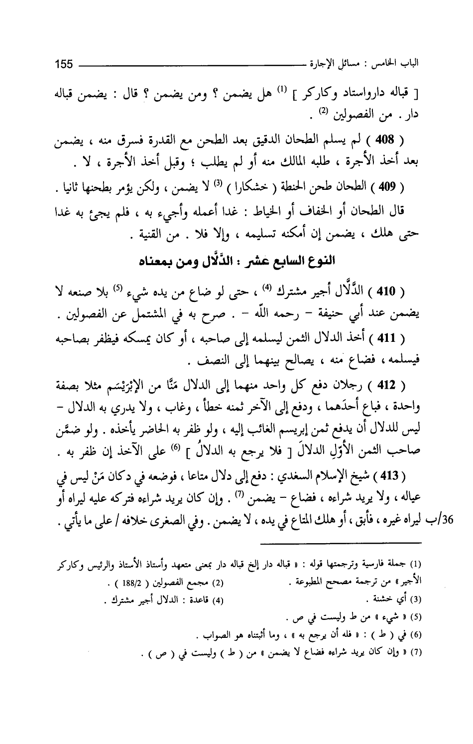 قباله دار واستاد وكار كر هل يضمن ومن يضمن قال يضمن قباله دار. من الفصولين. لم يسلم الطحان الدقيق بعد الطحن مع القدرة فسرق منه يضمن بعد أخذ الأجرة طلبه المالك منه أو لم يطلب وقبل أخذ الأجرة لا الطحان طحن الحنطة خشكارا لا يضمن ولكن يؤمر بطحنها ثانيا قال الطحان أو الخفاف أو الخياط غدا أعمله وأجيء به فلم يجيء به غدا حتى هلك يضمن إن أمكنه تسليمه وإلا فلا. من القنية. النوع السابع عشر الدلال ومن بمعناه الدلال أجير مشترك حتى لو ضاع من يده شيء بلا صنعه لا يضمن عند أبي حنيفة صرح به في المشتمل عن الفصولين أخذ الدلال الثمن ليسلمه إلى صاحبه أو كان يمسكه فيظفر بصاحبه فيسلمه فضاع منه يصالح بينهما إلى النصف رجلان دفع كل واحد منهما إلى الدلال منا من الإبريسم مثلا بصفة واحدة فباع أحدهما ودفع إلى الآخر ثمنه خطأ وغاب ولا يدري به الدلال ليس للدلال أن يدفع ثمن إبريسم الغائب إليه ولو ظفر به الحاضر يأخذه ولو ضمن صاحب الثمن الأول الدلال فله أن يرجع به على الآخذ إن ظفر به شيخ الإسلام السعدي دفع إلى دلال متاعا فوضعه في دكان من ليس في عياله ولا يريد شراءه فضاع يضمن وإن كان يريد شراءه فضاع لا يضمن وإن كان يريد شراءه فتركه عليه ليراه أو ليراه غيره فأبق أو هلك المتاع في يده لا يضمن وفي الصغرى خلافه على ما يأتي
