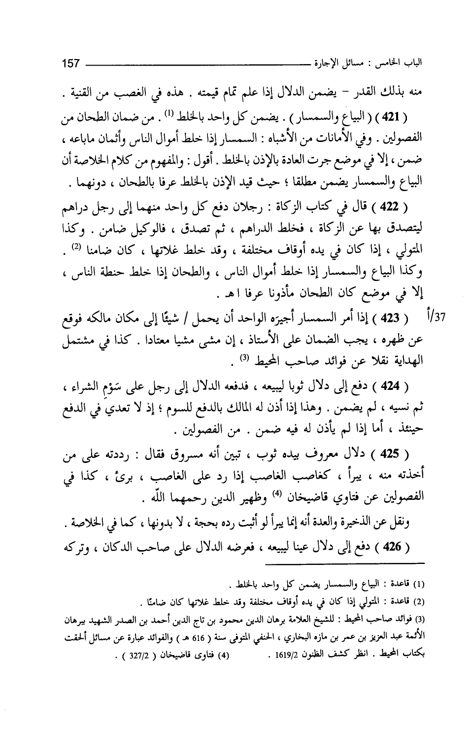 منه بذلك القدر يضمن الدلال إذا علم تمام قيمته هذه في الغصب. من القنية. البياع والسمسار يضمن كل واحد بالخلط من ضمان الطحان. من الفصولين. وفي الأمانات. من الأشباه.السمسار إذا خلط أموال الناس وأثمان ما باعه ضمن إلا في موضع جرت العادة بالإذن بالخلط أقول والمفهوم من كلام الخلاصة أن البياع والسمسار يضمن مطلقا حيث قيد الإذن بالخلط عرفا بالطحان دونهما قال في كتاب الزكاة رجلان دفع كل واحد منهما إلى رجل دراهم ليتصدق بها عن الزكاة فخلط الدراهم ثم تصدق فالوكيل ضامن وكذا المتولي إذا كان في يده أوقاف مختلفة وقد خلط غلاتها كان ضامنا وكذا البياع والسمسار إذا خلط أموال الناس والطحان إذا خلط حنطة الناس إلا في موضع كان الطحان مأذونا عرفا ا هـ إذا أمر السمسار أجيره الواحد أن يحمل شيئا إلى مكان مالكه فوقع عن ظهره يجب الضمان على الأستاذ إن مشى مشيا معتادا كذا في مشتمل الهداية نقلا عن فوائد صاحب المحيط دفع إلى دلال ثوبا ليبيعه فدفعه الدلال إلى رجل على سوم الشراء ثم نسيه لم يضمن وهذا إذا أذن له المالك بالدفع للسوم إذ لا تعدي في الدفع حينئذ أما إذا لم يأذن له فيه ضمن. من الفصولين. دلال معروف بيده ثوب تبين أنه مسروق فقال رددته على من أخذته منه يبرأ كغاصب الغاصب إذا رد على الغاصب برئ كذا في الفصولين عن فتاوى قاضي خان وظهير الدين ونقل عن الذخيرة والعدة أنه إنما يبرأ لو أثبت رده بحجة لا بدونها كما في الخلاصة دفع إلى دلال عينا ليبيعه فعرضه الدلال على صاحب الدكان وتركه