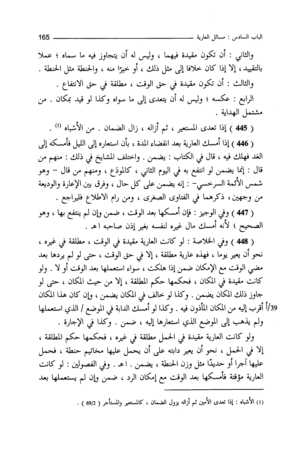 والثاني أن تكون مقيدة فيهما وليس له أن يتجاوز فيه ما سماه عملا بالتقييد إلا إذا كان خلافا إلى مثل ذلك أو خير منه والحنطة مثل الحنطة الثالث أن تكون مقيدة في حق الوقت مطلقة في حق الانتفاع الرابع عكسه وليس له أن يتعدى إلى ما سواه وكذا لو قيد بمكان من مشتمل الهداية إذا تعدى المستعير ثم أزاله زال الضمان. من الأشباه.إذا أمسك العارية بعد انقضاء المدة بأن استعاره إلى الليل فأمسكه إلى الغد فهلك فيه قال في الكتاب يضمن واختلف المشايخ في ذلك منهم من قال إنما يضمن لو انتفع به في اليوم الثاني كالمودع ومنهم من قال وهو شمس الأئمة السرخسي إنه يضمن على كل حال وفرق بين الإعارة الوديعة من وجهين ذكرهما في الفتاوى الصغرى ومن رام الاطلاع فليراجع وفي الوجيز فإن أمسكها بعد الوقت ضمن وإن لم ينتفع بها وهو الصحيح لأنه أمسك مال غيره لنفسه بغير إذن صاحبه ا هـ وفي الخلاصة لو كانت العارية مقيدة في الوقت مطلقة في غيره نحو أن يعير يوما فهذه عارية مطلقة إلا في حق الوقت حتى لو لم يردها بعد مضي الوقت مع الإمكان ضمن إذا هلكت سواء استعملها بعد الوقت أو لا ولو كانت مقيدة في المكان فحكمها حكم المطلقة إلا من حيث المكان حتى لو جاوز ذلك المكان يضمن وكذا لو خالف في المكان يضمن وإن كان هذا المكان أقرب إليه من المكان المأذون فيه وكذا لو أمسك الدابة في الموضع الذي استعملها ولم يذهب إلى الموضع الذي استعارها إليه ضمن وكذا في الإجارة ولو كانت العارية مقيدة في الحمل مطلقة في غيره فحكمها حكم المطلقة إلا في الحمل نحو أن يعير دابته على أن يحمل عليها عشرة مخاتيم حنطة فحمل عليها آجرا أو حديدا مثل وزن الحنطة يضمن ا هـ وفي الفصولين لو كانت العارية مؤقتة فأمسكها بعد الوقت مع إمكان الرد ضمن وإن لم يستعملها بعد