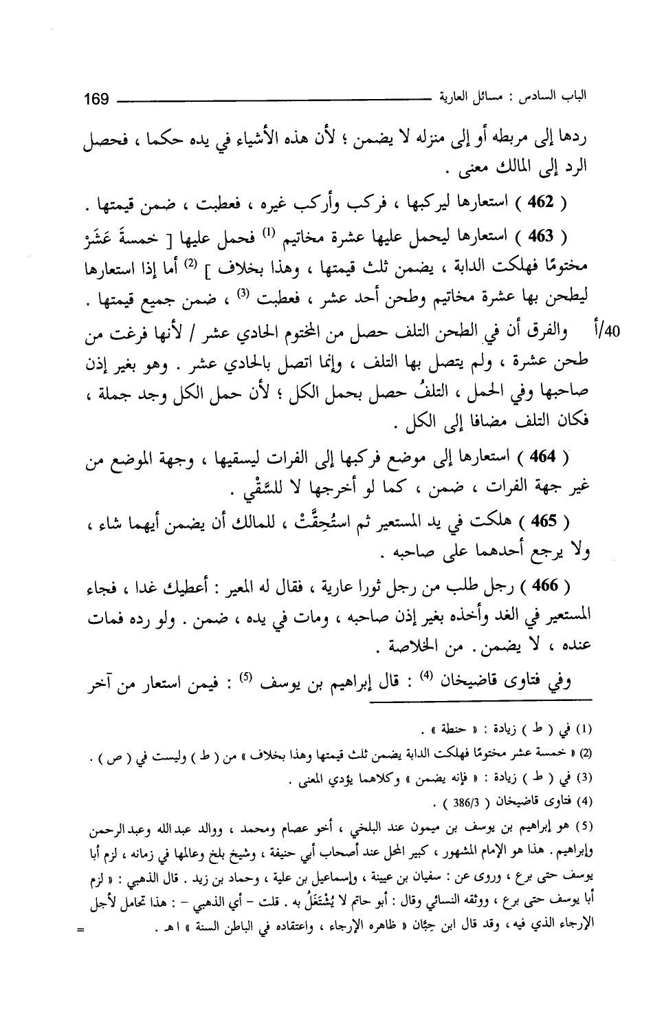 ردها إلى مربطه أو إلى منزله لا يضمن لأن هذه الأشياء في يده حكما فحصل الرد إلى المالك معنى استعارها ليركبها فركب وأركب غيره فعطبت ضمن قيمتها استعارها ليحمل عليها عشرة مخاتيم حنطة فحمل عليها خمسة عشر مختوما فهلكت الدابة يضمن ثلث قيمتها وهذا بخلاف ما إذا استعارها ليطحن بها عشرة مخاتيم وطحن أحد عشر فعطبت فإنه يضمن جميع قيمتها والفرق أن في الطحن التلف حصل من المختوم الحادي عشر لأنها فرغت من طحن عشرة ولم يتصل بها التلف وإنما اتصل بالحادي عشر وهو بغير إذن صاحبها وفي الحمل التلف حصل بحمل الكل لأن حمل الكل وجد جملة فكان التلف مضافا إلى الكل استعارها إلى موضع فركبها إلى الفرات ليسقيها وجهة الموضع من غير جهة الفرات ضمن كما لو أخرجها للسقي هلكت في يد المستعير ثم استحقت للمالك أن يضمن أيهما شاء ولا يرجع أحدهما على صاحبه رجل طلب من رجل ثورا عارية فقال له المعير أعطيك غدا فجاء المستعير في الغد وأخذه بغير إذن صاحبه ومات في يده ضمن ولو رده فمات عنده لا يضمن. من الخلاصة. وفي فتاوى قاضي خان قال إبراهيم بن يوسف فيمن استعار من آخر