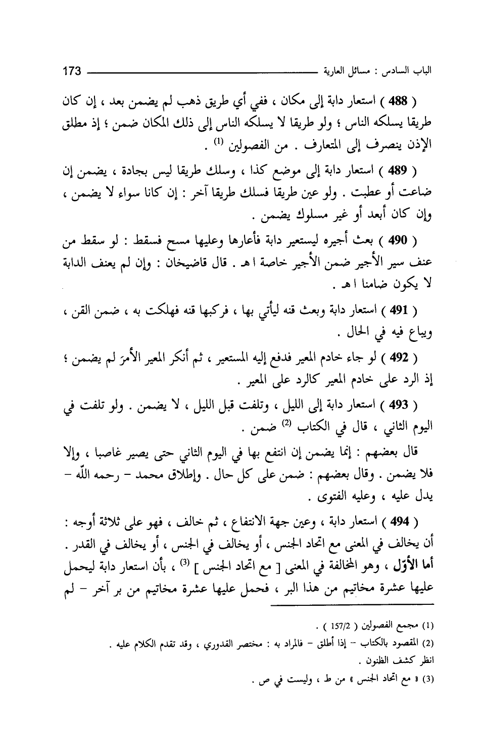 استعار دابة إلى مكان ففي أي طريق ذهب لم يضمن بعد أن كان طريقا يسلكه الناس ولو كان طريقا لا يسلكه الناس إلى ذلك المكان ضمن إذ مطلق الإذن ينصرف إلى المتعارف. من الفصولين. وفي الخلاصة استعار دابة إلى موضع كذا وسلك طريقا ليس بجادة يضمن إن ضاعت أو عطبت ولو عين طريقا فسلك طريقا آخر إن كانا سواء لا يضمن وإن كان أبعد أو غير مسلوك يضمن بعث أجيره ليستعير دابة فأعارها وعليها مسح فسقط لو سقط من عنف سير الأجير ضمن الأجير خاصة ا هـ قال قاضي خان وإن لم يعنف الدابة لا يكون ضامنا ا هـ استعار دابة وبعث قنه ليأتي بها فركبها قنه فهلكت به ضمن القن ويباع فيه في الحال لو جاء خادم المعير فدفع إليه المستعير ثم أنكر المعير الأمر لم يضمن إذ الرد على خادم المعير كالرد على المعير استعار دابة إلى الليل وتلفت قبل الليل لا يضمن ولو تلفت في اليوم الثاني قال في الكتاب ضمن قال بعضهم إنما يضمن إن انتفع بها في اليوم الثاني حتى يصير غاصبا وإلا فلا يضمن وقال بعضهم ضمن على كل حال وإطلاق محمد يدل عليه وعليه الفتوى استعار دابة وعين جهة الانتفاع ثم خالف فهو على ثلاثة أوجه أن يخالف في المعنى مع اتحاد الجنس أو يخالف في الجنس أو يخالف في القدر أما الأول وهو المخالفة في المعنى مع اتحاد الجنس بأن استعار دابة ليحمل عليها عشرة مخاتيم من هذا البر فحمل عليها عشرة مخاتيم من بر آخر