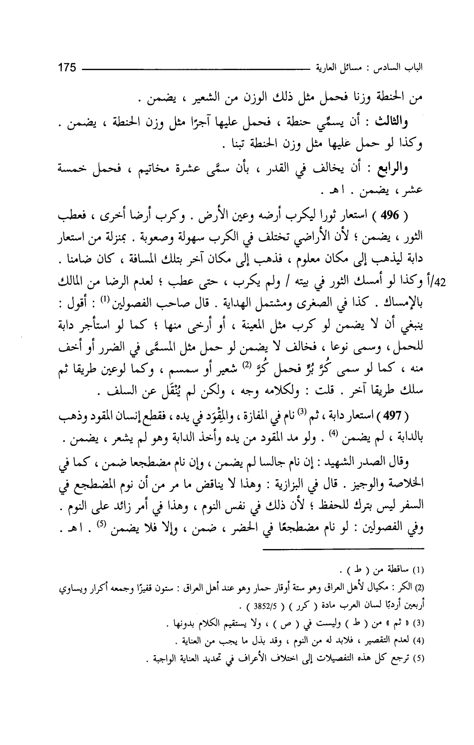 من الحنطة وزنا فحمل مثل ذلك الوزن من الشعير يضمن والثالث أن يسمي حنطة فحمل عليها آجرا مثل وزن الحنطة يضمن وكذا لو حمل مثل وزن الحنطة تبنا والرابع أن يخالف في القدر بأن سمى عشرة مخاتيم فحمل خمسة عشر يضمن ا هـ استعار ثورا ليكرب أرضه وعين الأرض وكرب أرضا أخرى فعطب الثور يضمن لأن الأراضي تختلف في الكرب سهولة وصعوبة بمنزلة من استعار دابة ليذهب إلى مكان معلوم فذهب إلى مكان آخر بتلك المسافة كان ضامنا وكذا لو أمسك الثور في بيته ولم يكرب حتى عطب لعدم الرضا من المالك بالإمساك كذا في الصغرى ومشتمل الهداية قال صاحب الفصولين أقول ينبغي أن لا يضمن لو كرب مثل المعينة أو أرخى منها كما لو استأجر دابة للحمل وسمى نوعا فخالف لا يضمن لو حمل مثل المسمى في الضرر أو أخف منه كما لو سمى كر بر فحمل كر شعير أو سمسم وكما لو عين طريقا ثم سلك طريقا آخر قلت ولكلامه وجه ولكن لم ينقل عن السلف استعار دابة ثم نام في المفازة والمقود في يده فقطع إنسان المقود وذهب بالدابة لم يضمن ولو مد المقود من يده وأخذ الدابة وهو لم يشعر يضمن وقال الصدر الشهيد إن نام جالسا لم يضمن وإن نام مضطجعا ضمن كما في الخلاصة والوجيز قال في البزازية وهذا لا يناقض ما مر من أن نوم المضطجع في السفر ليس بترك للحفظ لأن ذلك في نفس النوم وهذا في أمر زائد على النوم وفي الفصولين لو نام مضطجعا في الحضر ضمن وإلا فلا يضمن ا ه