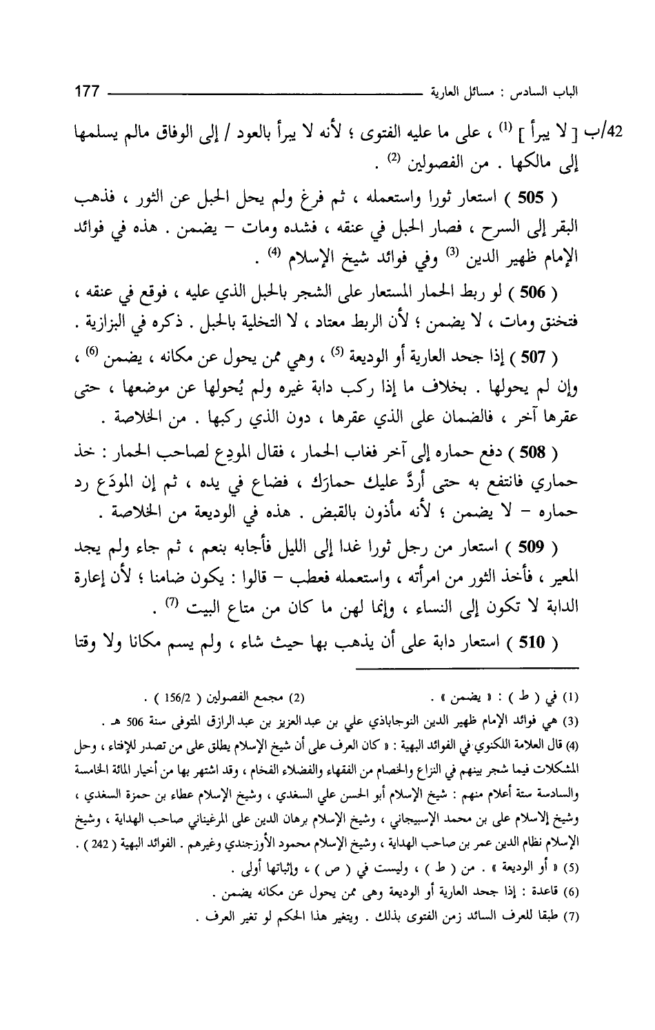 سقط لا يبرأ على ما عليه الفتوى لأنه لا يبرأ بالعود إلى الوفاق ما لم يسلمها إلى مالكها. من الفصولين. استعار ثورا واستعمله ثم فرغ ولم يحل الحبل عن الثور فذهب البقر إلى المسرح فصار الحبل في عنقه فشده ومات يضمن هذه في فوائد الإمام ظهير الدين وفي فوائد شيخ الإسلام لو ربط الحمار المستعار على الشجر بالحبل الذي عليه فوقع في عنقه فتخنق ومات لا يضمن لأن الربط معتاد لا التخلية بالحبل ذكره في البزازية إذا جحد العارية أو الوديعة وهي ممن يحول عن مكانه يضمن وإن لم يحولها بخلاف ما إذا ركب دابة غيره ولم يحولها عن موضعها حتى عقرها آخر فالضمان على الذي عقرها دون الذي ركبها. من الخلاصة. دفع حماره إلى آخر فغاب الحمار فقال المودع لصاحب الحمار خذ حماري فانتفع به حتى أرد عليك حمارك فضاع في يده ثم إن المودع رد حماره لا يضمن لأنه مأذون بالقبض هذه في الوديعة. من الخلاصة. استعار من رجل ثورا غدا إلى الليل فأجابه بنعم ثم جاء ولم يجد المعير فأخذ الثور من امرأته واستعمله فعطب قالوا يكون ضامنا لأن إعارة الدابة لا تكون إلى النساء وإنما لهن ما كان من متاع البيت استعار دابة على أن يذهب بها حيث شاء ولم يسم مكانا