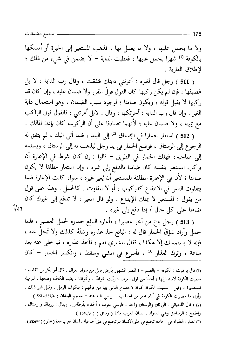 ولا وقتا ولا ما يحمل عليها ولا ما يعمل بها فذهب المستعير إلى الحيرة أو أمسكها بالكوفة شهرا يحمل عليها فعطبت الدابة لا يضمن في شيء من ذلك لإطلاق العارية رجل قال لغيره أعرتني دابتك فنفقت وقال رب الدابة لا بل غصبتها فإن لم يكن ركبها كان القول قول المقر ولا ضمان عليه وإن كان قد ركبها لا يقبل قوله ويكون ضامنا لوجود سبب الضمان وهو استعمال دابة الغير وإن قال رب الدابة آجرتكها وقال لا بل أعرتني فالقول قول الراكب مع يمينه ولا ضمان عليه لأنهما تصادقا على أن الركوب كان بإذن المالك استعار حمارا في الرستاق إلى البلد فلما أتى البلد لم يتفق له الرجوع إلى الرستاق فوضع الحمار في يد رجل ليذهب به إلى الرستاق ويسلمه إلى صاحبه فهلك الحمار في الطريق قالوا إن كان الشرط في الإعارة أن يركب المستعير بنفسه كان ضامنا بالدفع إلى غيره وإن استعار مطلقا لا يكون ضامنا لأن في الإعارة المطلقة للمستعير أن يعير غيره سواء كانت الإعارة فيما يتفاوت الناس في الانتفاع كالركوب أو لا يتفاوت كالحمل وهذا على قول من يقول المستعير لا يملك الإيداع ولو قال المعير لا تدفع إلى غيرك كان ضامنا على كل حال إذا دفع إلى غيره رجل باع من آخر عصيرا فأعاره البائع حماره لحمل العصير فلما حمل وأراد سوق الحمار قال له البائع خذ عذاره وسقه كذلك ولا تخل عنه فإنه لا يستمسك إلا هكذا فقال المشتري نعم فأخذ عذاره ثم خلى عنه بعد ساعة وترك العذار فأسرع في المشي وسقط وانكسر الحمار كان