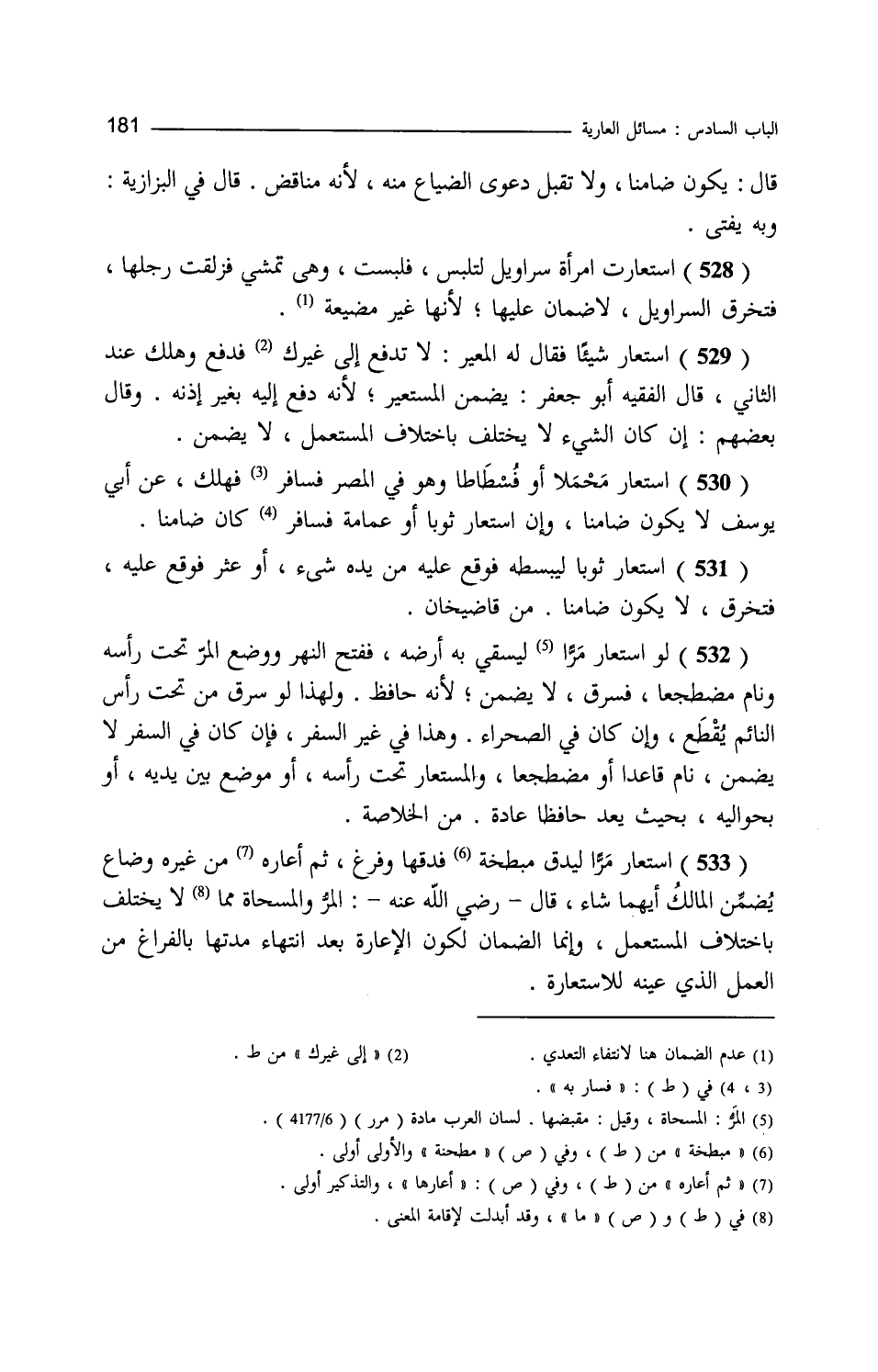 قال يكون ضامنا ولا تقبل دعوى الضياع منه لأنه مناقض قال في البزازية وبه يفتى استعارت امرأة سراويل لتلبس فلبست وهي تمشي فزلقت رجلها فتخرق السراويل لا ضمان عليها لأنها غير مضيعة استعار شيئا فقال له المعير لا تدفع إلى غيرك فدفع وهلك عند الثاني قال الفقيه أبو جعفر يضمن المستعير لأنه دفع إليه بغير إذنه وقال بعضهم إن كان الشيء لا يختلف باختلاف المستعمل لا يضمن استعار حملا أو فسطاطا وهو في المصر فسار به فهلك عن أبي يوسف لا يكون ضامنا وإن استعار ثوبا أو عمامة فسار به كان ضامنا استعار ثوبا ليبسطه فوقع عليه من يده شيء أو عثر فوقع عليه فتخرق لا يكون ضامنا. من قاضي خان. لو استعار مرا ليسقي به أرضه ففتح النهر ووضع المر تحت رأسه ونام مضطجعا فسرق لا يضمن لأنه حافظ ولهذا لو سرق من تحت رأس النائم يقطع وإن كان في الصحراء وهذا في غير السفر فإن كان في السفر لا يضمن نام قاعدا أو مضطجعا والمستعار تحت رأسه أو موضوع بين يديه أو بحواليه بحيث يعد حافظا عادة. من الخلاصة. استعار مرا ليدق مبطخة فدقها وفرغ ثم أعاره من غيره وضاع يضمن المالك أيهما شاء قال رضي الله عنه المر والمسحاة ما لا يختلف باختلاف المستعمل وإنما الضمان لكون الإعارة بعد انتهاء مدتها بالفراغ من العمل الذي عينه للاستعارة