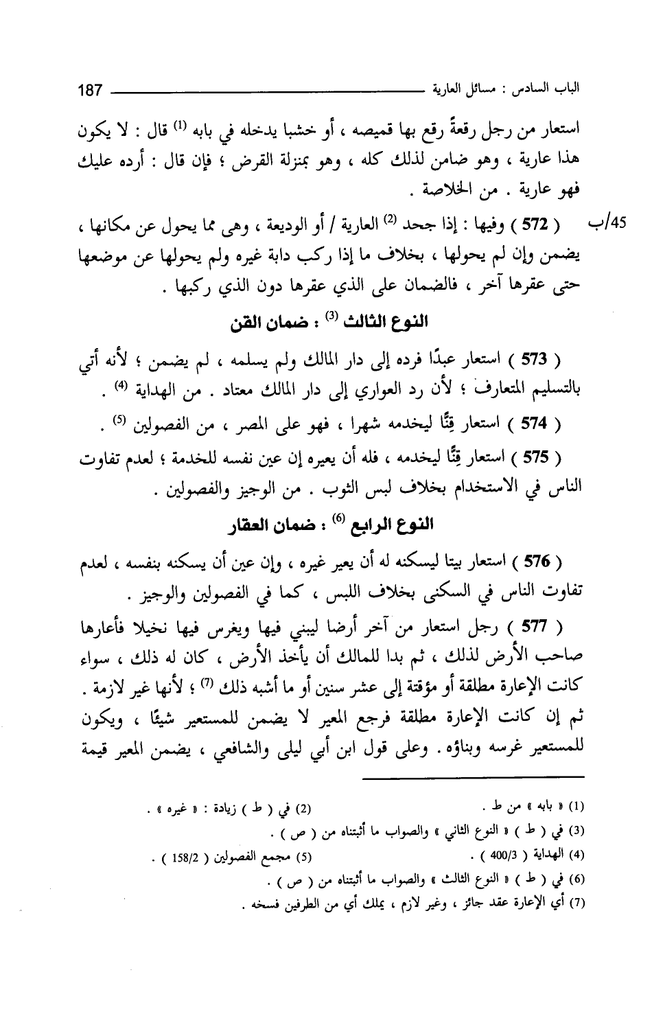 استعار من رجل رقعة رقع بها قميصه أو خشبا يدخله في بابه قال لا يكون هذا عارية وهو ضامن لذلك كله وهو بمنزلة القرض فإن قال أرده عليك فهو عارية. من الخلاصة. وفيها إذا جحد غيره العارية أو الوديعة وهي مما يحول عن مكانها يضمن وإن لم يحولها بخلاف ما إذا ركب دابة غيره ولم يحولها عن موضعها حتى عقرها آخر فالضمان على الذي عقرها دون الذي ركبها النوع الثالث ضمان القن استعار عبدا فرده إلى دار المالك ولم يسلمه لم يضمن لأنه أتى بالتسليم المتعارف لأن رد العواري إلى دار المالك معتاد. من الهداية. استعار قنا ليخدمه شهرا فهو على المصر. من الفصولين. استعار قنا ليخدمه فله أن يعيره وإن عين نفسه للخدمة لعدم تفاوت الناس في الاستخدام بخلاف لبس الثوب. من الوجيز. والفصولين النوع الرابع ضمان العقار استعار بيتا ليسكنه له أن يعير غيره وإن عين أن يسكنه بنفسه لعدم تفاوت الناس في السكنى بخلاف اللبس كما في الفصولين والوجيز رجل استعار من آخر أرضا ليبني فيها ويغرس فيها نخيلا فأعارها صاحب الأرض لذلك ثم بدا للمالك أن يأخذ الأرض كان له ذلك سواء كانت الإعارة مطلقة أو مؤقتة إلى عشر سنين أو ما أشبه ذلك لأنها غير لازمة ثم إن كانت الإعارة مطلقة فرجع المعير لا يضمن للمستعير شيئا ويكون للمستعير غرسه وبناؤه على قول ابن أبي ليلى والشافعي يضمن المعير قيمة