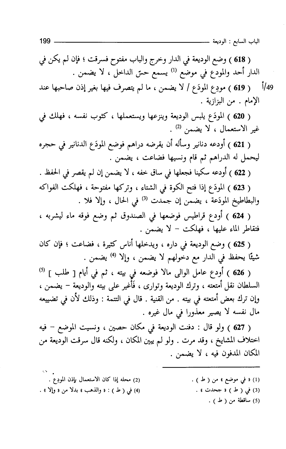 وضع الوديعة في الدار وخرج والباب مفتوح فسرقت فإن لم يكن في الدار أحد والمودع في موضع يسمع حس الداخل لا يضمن مودع المودع لا يضمن ما لم يتصرف فيها بغير إذن صاحبها عند الإمام . من البزازية. المودع يلبس الوديعة وينزعها ويستعملها كثوب نفسه فهلك في غير الاستعمال لا يضمن أودعه دنانير وسأله أن يقرضه دراهم فوضع المودع الدنانير في حجره ليحمل له الدراهم ثم قام ونسيها فضاعت يضمن أودعه سكينا فجعلها في ساق خفه لا يضمن إن لم يقصر في الحفظ المودع إذا فتح الكورة في الشتاء وتركها مفتوحة فهلكت الفواكه والبطاطيخ المودعة يضمن إن جحدت في الحال وإلا فلا أودع قراطيس فوضعها في الصندوق ثم وضع فوقه ماء ليشربه فتقاطر الماء عليها فهلكت لا يضمن وضع الوديعة في داره ويدخلها أناس كثيرة فضاعت فإن كان شيئا يحفظ في الدار مع دخولهم لا يضمن والذهب يضمن أودع عامل الوالي مالا فوضعه في بيته ثم في أيام السلطان نقل أمتعته وترك الوديعة وتوارى فأغير على بيته الوديعة يضمن وإن ترك بعض أمتعته في بيته. من القنية. قال في التتمة وذلك لأن في تضييعه مال نفسه لا يصير معذورا في مال غيره ولو قال دفنت الوديعة في مكان حصين ونسيت الموضع فيه اختلاف المشايخ وقد مرت ولو لم يبين المكان ولكنه قال سرقت الوديعة من المكان المدفون فيه لا يضمن