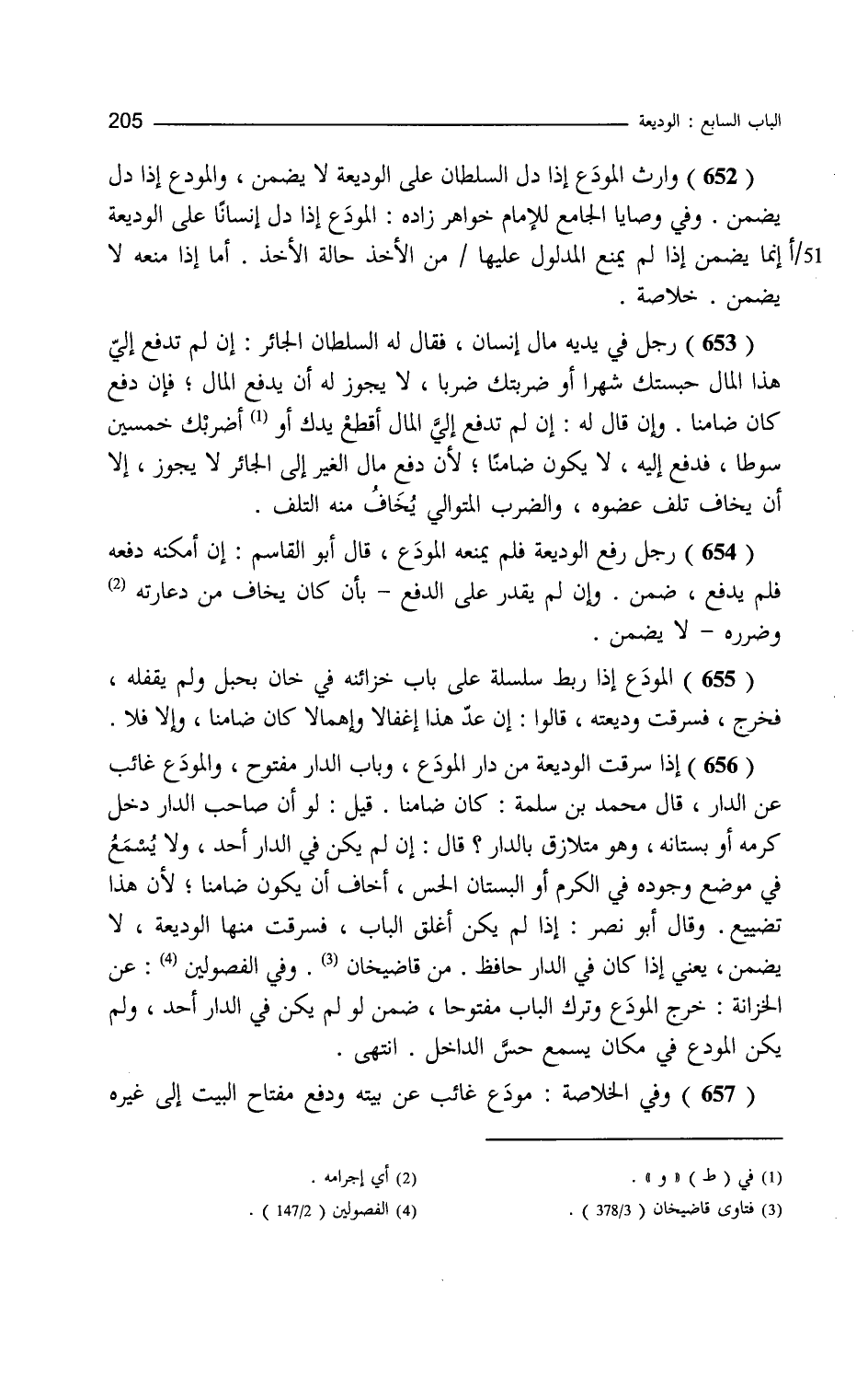 وارث المودع إذا دل السلطان على الوديعة لا يضمن والمودع إذا دل يضمن وفي وصايا الجامع للإمام خواهر زاده المودع إذا دل إنسانا على الوديعة إنما يضمن إذا لم يمنع المدلول عليها من الأخذ حالة الأخذ أما إذا منعه لا يضمن خلاصة رجل في يديه مال إنسان فقال له السلطان الجائر إن لم تدفع إلي هذا المال حبستك شهرا أو ضربتك ضربا لا يجوز له أن يدفع المال فإن دفع كان ضامنا وإن قال له إن لم تدفع إلي المال أقطع يدك وأضربك خمسين سوطا فدفع إليه لا يكون ضامنا لأن دفع مال الغير إلى الجائر لا يجوز إلا أن يخاف تلف عضوه والضرب المتوالي يخاف منه التلف رجل رفع الوديعة فلم يمنعه المودع قال أبو القاسم إن أمكنه دفعه فلم يدفع ضمن وإن لم يقدر على الدفع بأن كان يخاف من إعارته وضرره لا يضمن المودع إذا ربط سلسلة على باب خزائنه في خان بحبل ولم يقفله فخرج فسرقت وديعته قالوا إن عد هذا إغفالا وإهمالا كان ضامنا وإلا فلا إذا سرقت الوديعة من دار المودع وباب الدار مفتوح والمودع غائب عن الدار قال محمد بن سلمة كان ضامنا قيل لو أن صاحب الدار دخل كرمه أو بستانه وهو متلازق بالدار قال إن لم يكن في الدار أحد ولا يسمع في موضع الحس أخاف أن يكون ضامنا لأن هذا تضييع وقال أبو نصر إذا لم يكن أغلق الباب فسرقت منها الوديعة لا يضمن يعني إذا كان في الدار حافظا. من قاضي خان. وفي الفصولين عن الخزانة خرج المودع وترك الباب مفتوحا ضمن لو لم يكن في الدار أحد ولم يكن المودع في مكان يسمع حس الداخل انتهى وفي الخلاصة مودع غائب عن بيته ودفع مفتاح البيت إلى غيره