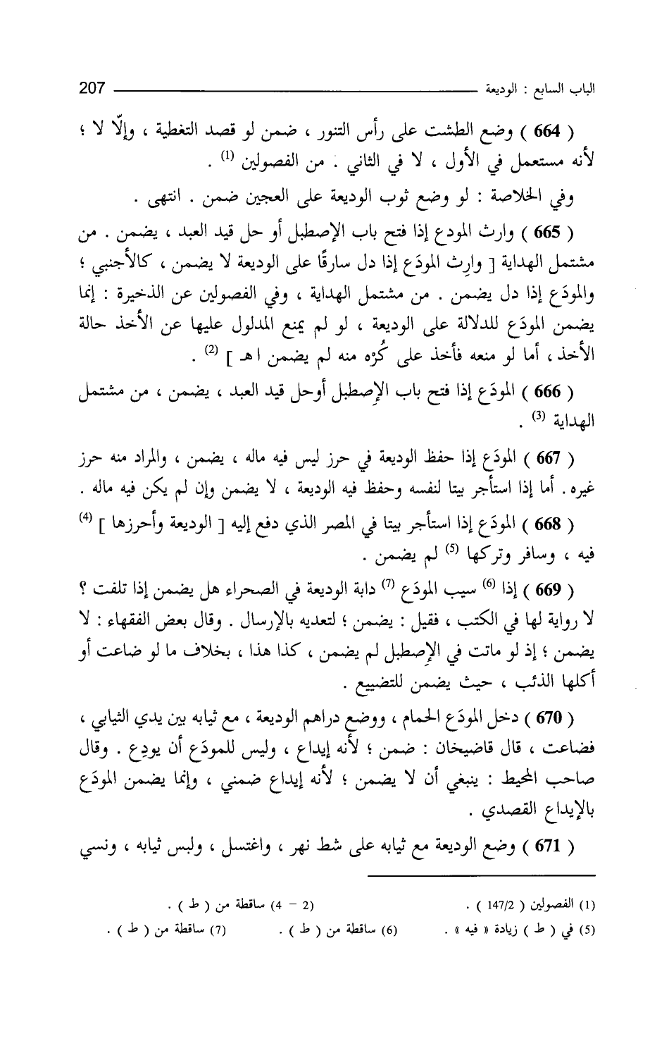 وضع الطشت على رأس التنور ضمن لو قصد التغطية وإلا لا لأنه مستعمل في الأول لا في الثاني. من الفصولين. وفي الخلاصة لو وضع ثوب الوديعة على العجين ضمن انتهى وارث المودع إذا فتح باب الإصطبل أو حل قيد العبد يضمن من مشتمل الهداية المودع إذا حفظ الوديعة في حرز ليس فيه ماله يضمن والمراد منه حرز غيره أما إذا استأجر بيتا لنفسه وحفظ فيه الوديعة لا يضمن وإن لم يكن فيه ماله المودع إذا استأجر بيتا في المصر الذي دفع إليه فيه وسافر وتركها فيه لم يضمن سيب دابة الوديعة في الصحراء هل يضمن إذا تلفت لا رواية لها في الكتب فقيل يضمن لتعديه بالإرسال وقال بعض الفقهاء لا يضمن إذ لو ماتت في الإصطبل لم يضمن كذا هذا بخلاف ما لو ضاعت أو أكلها الذئب حيث يضمن للتضييع دخل المودع الحمام ووضع دراهم الوديعة مع ثيابه بين يدي الثيابي فضاعت قال قاضي خان ضمن لأنه إيداع وليس للمودع أن يودع وقال صاحب المحيط ينبغي أن لا يضمن لأنه إيداع ضمني وإنما يضمن المودع بالإيداع القصدي وضع الوديعة مع ثيابه على شط نهر واغتسل ولبس ثيابه ونسي