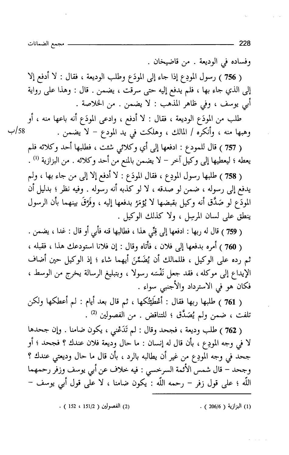وفساده في الوديعة. من قاضي خان. رسول المودع إذا جاء إلى المودع وطلب الوديعة فقال لا أدفع إلا إلى الذي جاء بها فلم يدفع إليه حتى سرقت يضمن قال وهذا على رواية أبي يوسف وفي ظاهر المذهب لا يضمن. من الخلاصة. طلب من المودع الوديعة فقال لا أدفع وادعى المودع أنه باعها منه أو وهبها منه وأنكره المالك وهلكت في يد المودع لا يضمن قال للمودع ادفعها إلى أي وكلائي شئت فطلبها أحد وكلائه فلم يعطه ليعطيها إلى وكيل آخر لا يضمن بالمنع من أحد وكلائه . من البزازية. طلبها رسول المودع فقال المودع لا أدفع إلا إلى من جاء بها ولم يدفع إلى رسوله ضمن لو صدقه لا لو كذبه أنه رسوله وفيه نظر بدليل أن المودع لو صدق أنه وكيل بقبضها لا يؤمر بدفعها إليه وفرق بينهما بأن الرسول ينطق على لسان المرسل ولا كذلك الوكيل قال له ربها ادفعها إلى قني هذا فطلبها قنه فأبى أو قال غدا يضمن أمره بدفعها إلى فلان فأتاه وقال إن فلانا استودعك هذا فقبله ثم رده على الوكيل فللمالك أن يضمن أيهما شاء إذ الوكيل حين أضاف الإيداع إلى موكله فقد جعل نفسه رسولا وبتبليغ الرسالة يخرج من الوسط فكان هو في الاسترداد والأجنبي سواء طلبها ربها فقال أعطيتكها ثم قال بعد أيام لم أعطكها ولكن تلفت ضمن ولم يصدق للتناقض. من الفصولين. طلب وديعة فجحد وقال لم تدعني يكون ضامنا وإن جحدها في وجه المودع بأن قال له إنسان ما حال وديعة فلان عندك فجحد أو جحد في وجه المودع من غير أن يطالبه بالرد بأن قال ما حال وديعتي عندك وجحد قال شمس الأئمة السرخسي فيه خلاف عن أبي يوسف وزفر على قول زفر يكون ضامنا لا على قول أبي يوسف