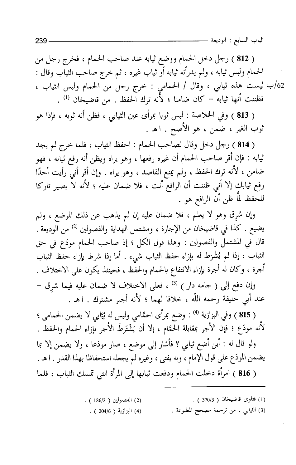 رجل دخل الحمام ونزع ثيابه بمحضر من صاحب الحمام فلما خرج لم يجد ثيابه ووجد صاحب الحمام نائما قالوا إن كان نائما قاعدا لا يكون ضامنا لأنه مستيقظ حكما فلم يك تاركا للحفظ وإن كان نائما مضطجعا واضعا جنبه على الأرض كان ضامنا لأنه تارك للحفظ. من قاضي خان. وقيل لا إذ نوم المستعير والمودع عند الأمانة مضطجعا يعد حفظا عادة من مشتمل الهداية والفصولين ويؤيده ما في الهداية من السرقة ولو نام المودع والمتاع تحته أو عنده لا يضمن لأنه ليس بتضييع ا هـ وفي الخلاصة لو نام الثيابي فسرقت الثياب إن نام قاعدا لا يضمن وإن نام مضطجعا يضمن الثيابي إذا خرج من الحمام فضاع ثوب إن تركه ضائعا ضمن وإن أمر الحلاق أو الحمامي أو من في عياله أن يحفظ لا يضمن وتفسير العيال مر رجل خرج من الحمام فقال كان في جيبي دراهم إن لم يقر الثيابي لا ضمان عليه أصلا وإن أقر إن تركه ضائعا ضمن وإن لم يضيعه فجواب أبي حنيفة وجوابهما وجواب الصلح قد ذكرناه في حبس القصار ا هـ أقول ونحن قد ذكرنا الأجوبة في الأجير المشترك من كتابنا هذا إن شئت راجع دخل الحمام ورجل جالس فنزع ثيابه وتركها عنده ولم يقل له احفظ ولا الرجل قال لا أحفظ ولم يقل أيضا لا أقبل فهو مودع يضمن لو ضيعه وكذا لو نزع الثياب حيث يرى الحمامي وهو ينظر إليه فخرج آخر ولبسه والحمامي يراه أو ضيعه يضمن من إجارة البزازية في المتفرقات رجل دخل الحمام ووضع ثيابه عند صاحب الحمام فخرج رجل من الحمام ولبس ثيابه ولم يدر أنه ثيابه أو ثياب غيره ثم خرج صاحب الثياب وقال ليست هذه ثيابي وقال الحمامي خرج رجل من الحمام ولبس الثياب فظننت أنها ثيابه كان ضامنا لأنه ترك الحفظ. من قاضي خان. وفي الخلاصة لبس ثوبا بمرأى عين الثيابي فظن أنه ثوبه فإذا هو ثوب الغير ضمن هو الأصح ا هـ رجل دخل وقال لصاحب الحمام احفظ الثياب فلما خرج لم يجد ثيابه فإن أقر صاحب الحمام أن غيره رفعها وهو يراه ويظن أنه رفع ثيابه فهو ضامن لأنه ترك الحفظ ولم يمنع القاصد وهو يراه وإن أقر أني رأيت أحدا رفع ثيابك إلا أني ظننت أن الرافع أنت فلا ضمان عليه لأنه لا يصير تاركا للحفظ لما ظن أن الرافع هو وإن سرق وهو لا يعلم فلا ضمان عليه إن لم يذهب عن ذلك الموضع ولم يضيع كذا في قاضي خان من الإجارة ومشتمل الهداية والفصولين من الوديعة قال في المشتمل والفصولين وهذا قول الكل إذ صاحب الحمام مودع في حق الثياب إذا لم يشرط له بإزاء حفظ الثياب شيء أما إذا شرط بإزاء حفظ الثياب أجرة وكان له أجرة بإزاء الانتفاع بالحمام والحفظ فحينئذ يكون على الاختلاف وإن دفع إلى جامه دار فعلى الاختلاف لا ضمان عليه فيما سرق عند أبي حنيفة خلافا لهما لأنه أجير مشترك ا هـ وفي البزازية وضع بمرأى الحمامي وليس له ثيابي لا يضمن الحمامي لأنه مودع فإن الأجر بمقابلة الحمام إلا أن يشترط الأجر بإزاء الحمام والحفظ ولو قال له أين أضع ثيابي فأشار إلى موضع صار مودعا ولا يضمن إلا بما يضمن المودع على قول الإمام وبه يفتي وغيره لم يجعله استحفاظا بهذا القدر ا هـ امرأة دخلت الحمام ودفعت ثيابها إلى المرأة التي تمسك الثياب فلما
