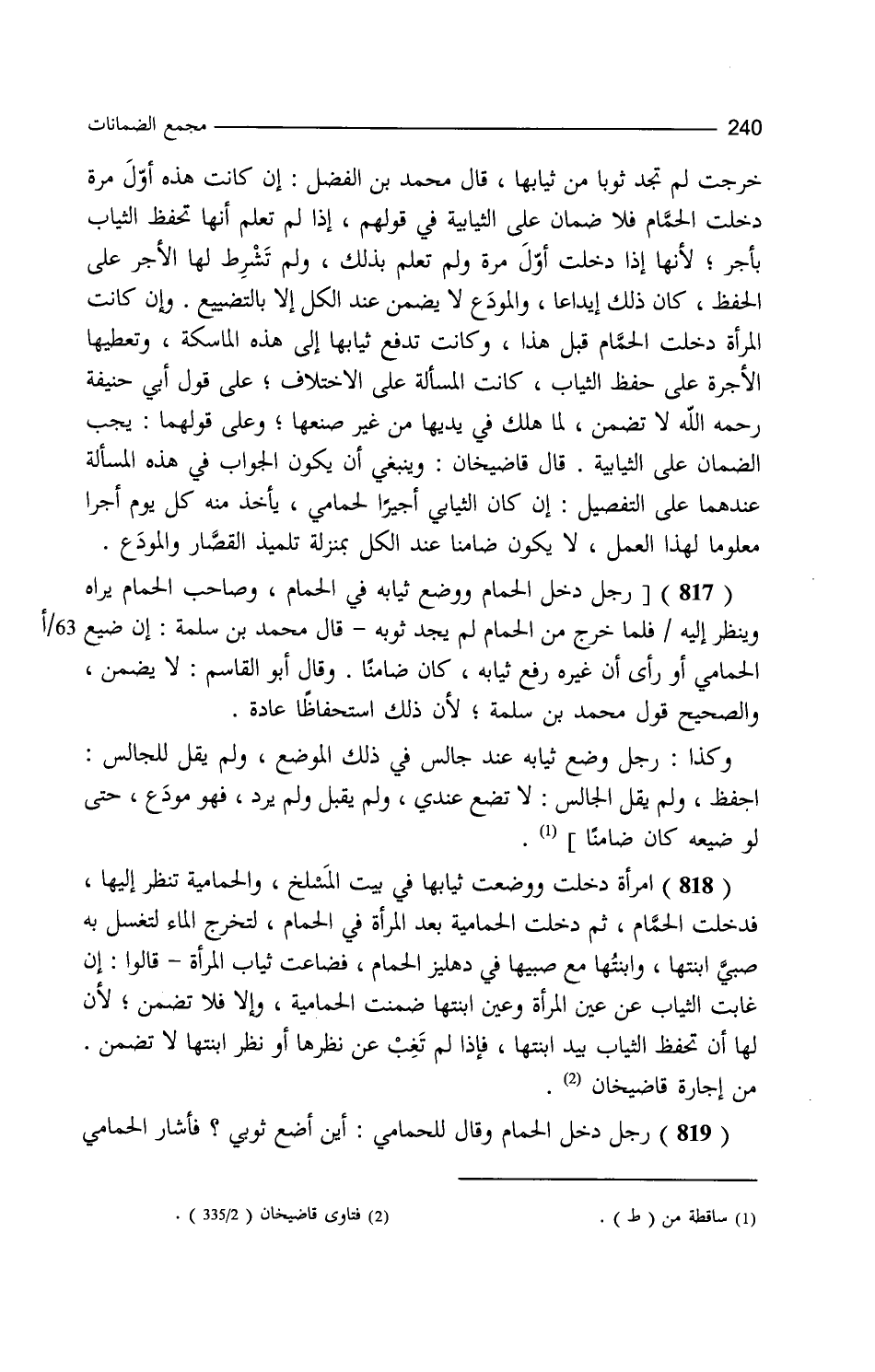 خرجت لم تجد ثوبا من ثيابها قال محمد بن الفضل إن كانت هذه أول مرة دخلت الحمام فلا ضمان على الثيابية في قولهم إذا لم تعلم أنها تحفظ الثياب بأجر لأنها إذا دخلت أول مرة ولم تعلم بذلك ولم تشرط لها الأجر على الحفظ كان ذلك إيداعا والمودع لا يضمن عند الكل إلا بالتضييع وإن كانت المرأة دخلت الحمام قبل هذا وكانت تدفع ثيابها إلى هذه الماسكة وتعطيها الأجرة على حفظ الثياب كانت المسألة على الاختلاف على قول أبي حنيفة لا تضمن لما هلك في يديها من غير صنعها وعلى قولهما يجب الضمان على الثيابية قال قاضي خان وينبغي أن يكون الجواب في هذه المسألة عندهما على التفصيل إن كان الثيابي أجيرا لحمامي يأخذ منه كل يوم أجرا معلوما لهذا العمل لا يكون ضامنا عند الكل بمنزلة تلميذ القصار والمودع امرأة دخلت ووضعت ثيابها في بيت المسلخ والحمامية تنظر إليها فدخلت الحمام ثم دخلت الحمامية بعد المرأة في الحمام لتخرج الماء لتغسل به صبي ابنتها وابنتها مع صبيها في دهليز الحمام فضاعت ثياب المرأة قالوا إن غابت الثياب عن عين المرأة وعين ابنتها ضمنت الحمامية وإلا فلا تضمن لأن لها أن تحفظ الثياب بيد ابنتها فإذا لم تغب عن نظرها أو نظر ابنتها لا تضمن من إجارة قاضي خان رجل دخل الحمام وقال للحمامي أين أضع ثوبي فأشار الحمامي