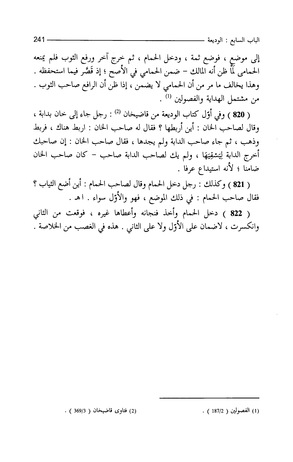 إلى موضع فوضع ثمة ودخل الحمام ثم خرج آخر ورفع الثوب فلم يمنعه الحمامي لما ظن أنه المالك ضمن الحمامي في الأصح إذ أنه قصر فيما استحفظه وهذا يخالف ما مر من أن الحمامي لا يضمن إذا ظن أن الرافع صاحب الثوب من مشتمل الهداية والفصولين وفي أول كتاب الوديعة. من قاضي خان. رجل جاء إلى خان بدابة وقال لصاحب الخان أين أربطها فقال له صاحب الخان اربط هناك فربط وذهب ثم جاء صاحب الدابة ولم يجدها فقال صاحب الخان إن صاحبك أخرج الدابة ليسقيها ولم يك لصاحب الدابة صاحب كان صاحب الخان ضامنا لأنه استيداع عرفا وكذلك رجل دخل الحمام وقال لصاحب الحمام أين أضع الثياب فقال صاحب الحمام في ذلك الموضع فهو والأول سواء ا هـ دخل الحمام وأخذ فنجانه وأعطاها غيره فوقعت من الثاني وانكسرت لا ضمان على الأول ولا على الثاني هذه في الغصب. من الخلاصة.