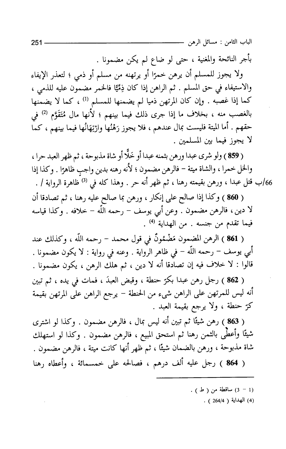 بأجر النائحة والمغنية حتى لو ضاع لم يكن مضمونا ولا يجوز للمسلم أن يرهن خمرا أو يرتهنه من مسلم أو ذمي لتعذر الإيفاء والاستيفاء في حق المسلم ثم الراهن إذا كان ذميا فالخمر مضمون عليه للذمي كما إذا غصبه وإن كان المرتهن ذميا لم يضمنها كما لا يضمنها بالغصب منه بخلاف ما إذا جرى ذلك فيما بينهم لأنها مال في حقهم أما الميتة فليست بمال عندهم فلا يجوز رهنها وارتهانها فيما بينهم كما لا يجوز فيما بين المسلمين ولو شرى عبدا ورهن بثمنه عبدا أو خلا أو شاة مذبوحة ثم ظهر العبد حرا والخل خمرا والشاة ميتة فالرهن مضمون لأنه رهنه بدين واجب ظاهرا وكذا إذا قتل عبدا ورهن بقيمته رهنا ثم ظهر أنه حر وهذا كله ظاهر الرواية وكذا إذا صالح على إنكار ورهن بما صالح عليه رهنا ثم تصادقا أن لا دين فالرهن مضمون وعن أبي يوسف خلافه وكذا قياسه فيما تقدم من جنسه. من الهداية. الرهن المضمون مضمون في قول محمد وكذلك عند أبي يوسف في ظاهر الرواية وعنه في رواية لا يكون مضمونا قالوا لا خلاف فيه إن تصادقا أنه لا دين ثم هلك الرهن يكون مضمونا رجل رهن عبدا بكر حنطة وقبض العبد فمات في يده ثم تبين أنه ليس للمرتهن على الراهن شيء من الحنطة يرجع الراهن على المرتهن بقيمة كر حنطة ولا يرجع بقيمة العبد رهن شيئا ثم تبين أنه ليس بمال فالرهن مضمون وكذا لو اشترى شيئا وأعطى بالثمن رهنا ثم استحق المبيع فالرهن مضمون وكذا لو استهلك شاة مذبوحة ورهن بالضمان شيئا ثم ظهر أنها كانت ميتة فالرهن مضمون رجل عليه ألف درهم فصالحه على خمسمائة وأعطاه رهنا