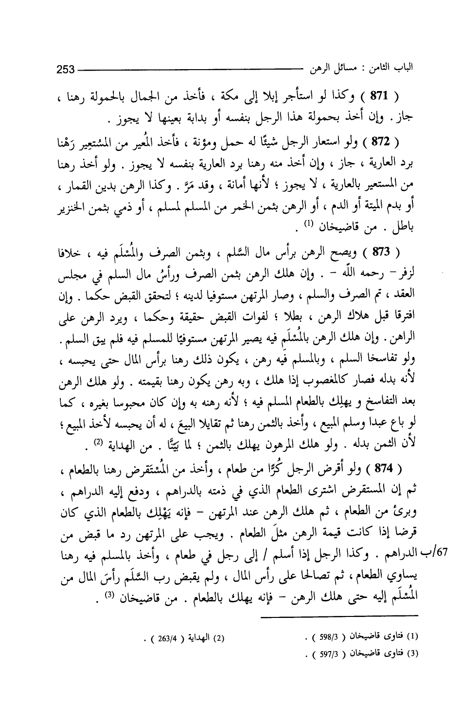 وكذا لو استأجر إبلا إلى مكة فأخذ من الجمال بالحمولة رهنا جاز وإن أخذ بحمولة هذا الرجل بنفسه أو بدابة بعينها لا يجوز ولو استعار الرجل شيئا له حمل ومؤنة فأخذ المعير من المستعير رهنا برد العارية جاز وإن أخذ منه رهنا برد العارية بنفسه لا يجوز ولو أخذ رهنا من المستعير بالعارية لا يجوز لأنها أمانة وقد مر وكذا الرهن بدين القمار أو بدم الميتة أو الدم أو الرهن بثمن الخمر من المسلم لمسلم أو ذمي بثمن الخنزير باطل. من قاضي خان. ويصح الرهن برأس مال السلم وبثمن الصرف والمسلم فيه خلافا لزفر وإن هلك الرهن بثمن الصرف ورأس مال المسلم في مجلس العقد تم الصرف والسلم وصار المرتهن مستوفيا لدينه لتحقق القبض حكما وإن افترقا قبل هلاك الرهن بطلا لفوات القبض حقيقة وحكما ويرد الرهن على الراهن وإن هلك لرهن بالمسلم فيه يصير المرتهن مستوفيا للمسلم فيه فلم يبق السلم ولو تفاسخا السلم وبالمسلم فيه رهن يكون ذلك رهنا برأس المال حتى يحبسه لأنه بدله فصار كالمغصوب إذا هلك وبه رهن يكون رهنا بقيمته ولو هلك الرهن بعد التفاسخ يهلك بالطعام المسلم فيه لأنه رهنه به وإن كان محبوسا بغيره كما لو باع عبدا وسلم المبيع وأخذ بالثمن رهنا ثم تقايلا البيع له أن يحبسه لأخذ المبيع لأن الثمن بدله ولو هلك المرهون يهلك بالثمن لما بينا. من الهداية. ولو أقرض الرجل كرا من طعام وأخذ من المستقرض رهنا بالطعام ثم أن المستقرض اشترى الطعام الذي في ذمته بالدراهم ودفع إليه الدراهم وبرئ من الطعام ثم هلك الرهن عند المرتهن فإنه يهلك بالطعام الذي كان قرضا إذا كانت قيمة الرهن مثل الطعام ويجب على المرتهن رد ما قبض من الدراهم وكذا الرجل إذا أسلم إلى رجل في طعام وأخذ بالمسلم فيه رهنا يساوي الطعام ثم تصالحا على رأس المال ولم يقبض رب السلم رأس المال من المسلم إليه حتى هلك الرهن فإنه يهلك بالطعام من قاضي خان
