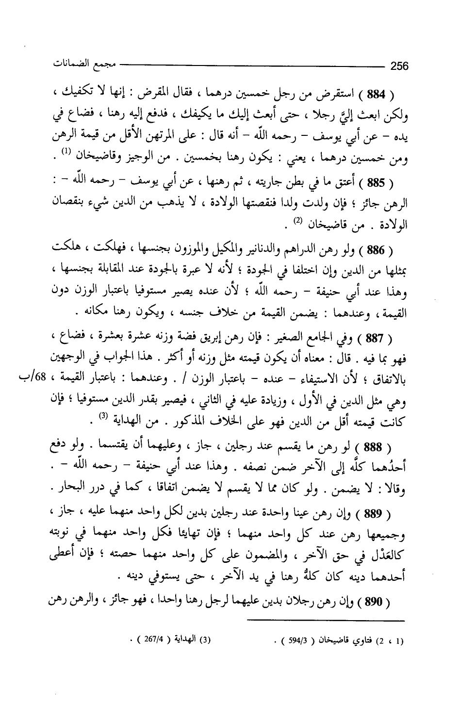 استقرض من رجل خمسين درهما فقال المقرض إنها لا تكفيك ولكن ابعث إلي رجلا حتى أبعث إليك ما يكفيك فدفع إليه رهنا فضاع في يده عن أبي يوسف أنه قال على المرتهن الأقل من قيمة الرهن ومن خمسين درهما يعني يكون رهنا بخمسين. من الوجيز. قاضي خان أعتق ما في بطن جاريته ثم رهنها عن أبي يوسف الرهن جائز فإن ولدت ولدا فنقصتها الولادة لا يذهب من الدين شيء بنقصان الولادة. من قاضي خان. ولو رهن الدراهم والدنانير والمكيل والموزون بجنسها فهلكت هلكت بمثلها من الدين وإن اختلفا في الجودة لأنه لا عبرة بالجودة عند المقابلة بجنسها وهذا عند أبي حنيفة لأن عنده يصير مستوفيا باعتبار الوزن دون القيمة وعندهما يضمن القيمة من خلاف جنسه ويكون رهنا مكانه وفي الجامع الصغير فإن رهن إبريق فضة وزنه عشرة بعشرة فضاع فهو بما فيه قال معناه أن يكون قيمته مثل وزنه أو أكثر هذا الجواب في الوجهين بالاتفاق لأن الاستيفاء عنده باعتبار الوزن وعندهما باعتبار القيمة وهي مثل الدين في الأول وزيادة عليه في الثاني فيصير بقدر الدين مستوفيا فإن كانت قيمته أقل من الدين فهو على الخلاف المذكور. من الهداية. لو رهن ما يقسم عند رجلين جاز وعليهما أن يقتسما ولو دفع أحدهما كله إلى الآخر ضمن نصفه وهذا عند أبي حنيفة وقالا لا يضمن ولو كان مما لا يقسم لا يضمن اتفاقا كما في درر البحار وإن رهن عينا واحدة عند رجلين بدين لكل واحد منهما عليه جاز وجميعها رهن عند كل واحد منهما فإن تهايآ فكل واحدة منهما في نوبته كالعدل في حق الآخر والمضمون على كل واحد منهما حصته فإن أعطى أحدهما دينه كان كله رهنا في يد الآخر حتى يستوفي دينه وإن رهن رجلان بدين عليهما لرجل رهنا واحدا فهو جائز والرهن رهن